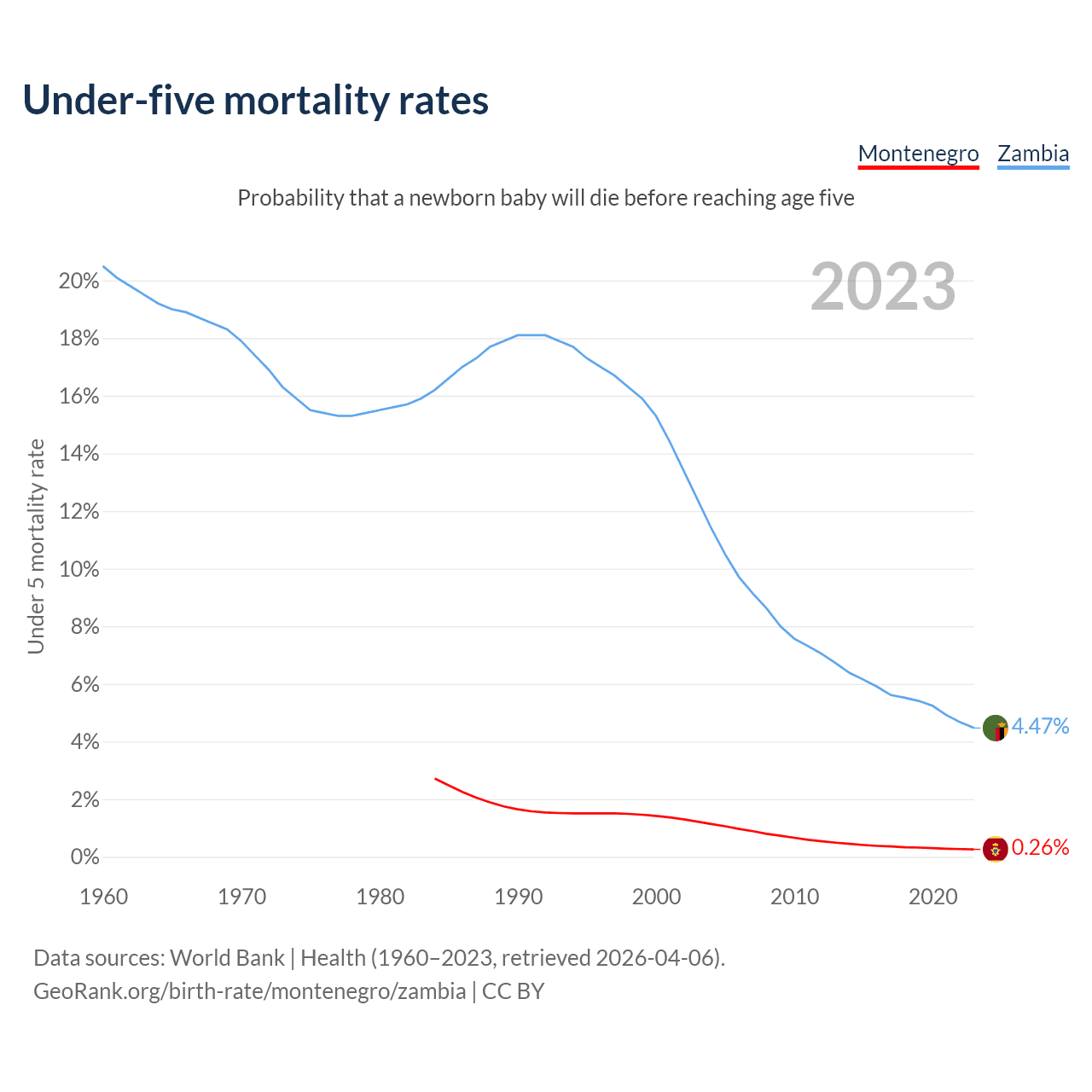 The chance that a newborn baby will die before reaching age five is 0.26% in Montenegro and 4.47% in Zambia. Above is a chart with historical data on under-five mortality rates.