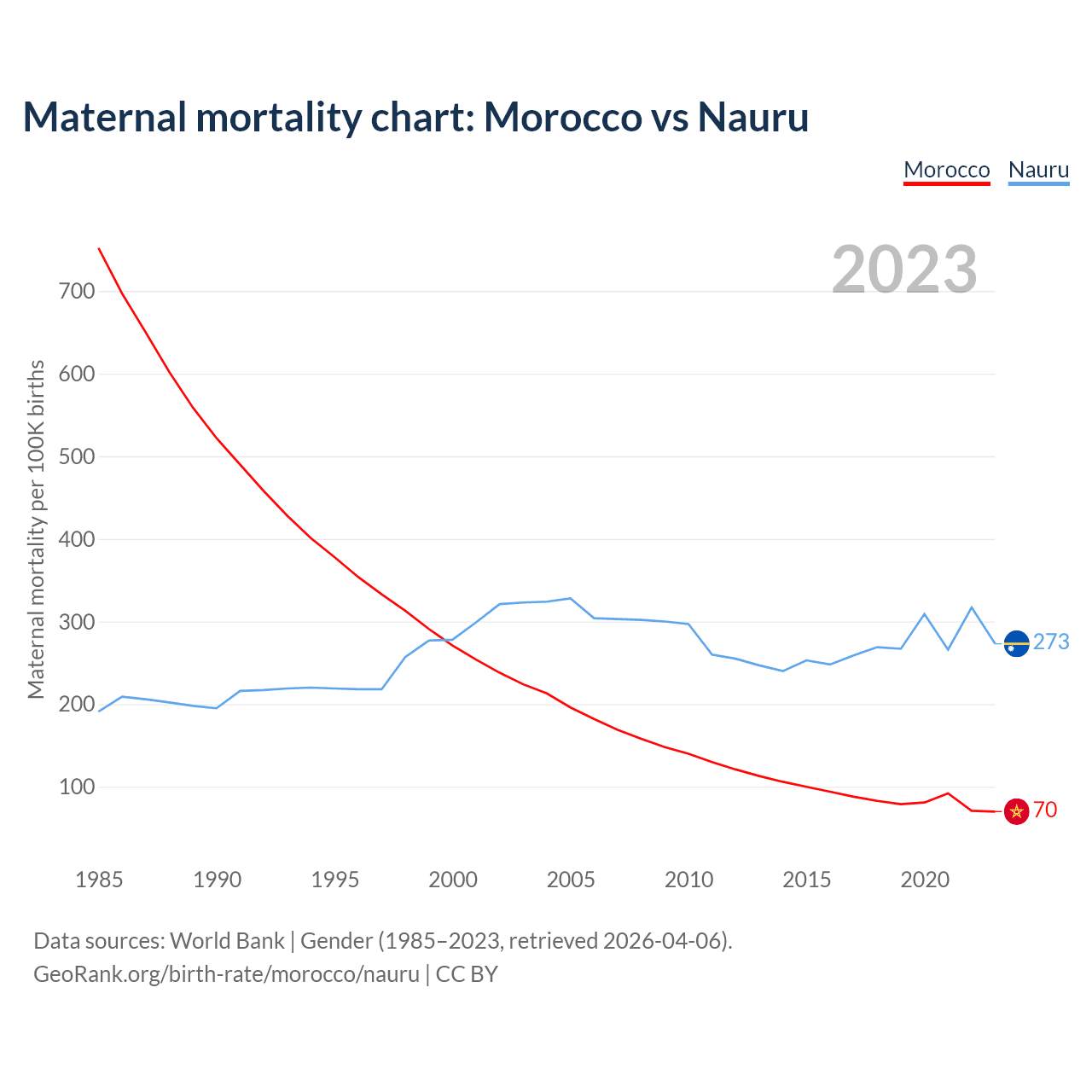 The maternal mortality rate, which is the probability of dying during childbirth or within 42 days of pregnancy termination, is 70 deaths per 100,000 live births in Morocco, compared to 273 deaths in Nauru.