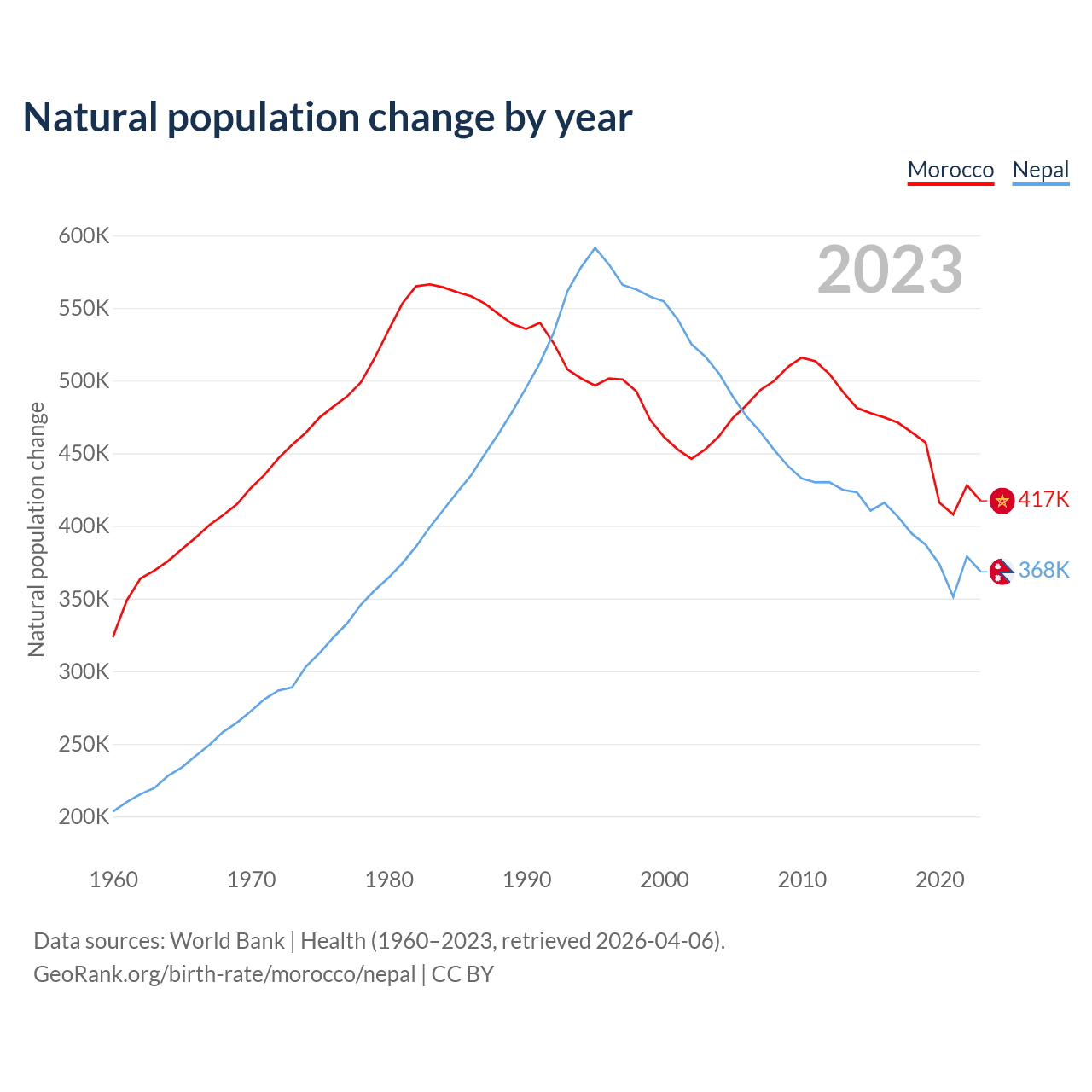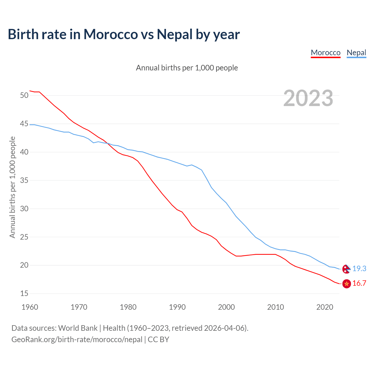 Morocco has an annual birth rate of 16.7 births per 1,000 people, compared to 19.3 for Nepal. The average number of children a woman is expected to have during her lifetime — the fertility rate, is 2.23 in Morocco and 1.98 in Nepal — 11% difference.