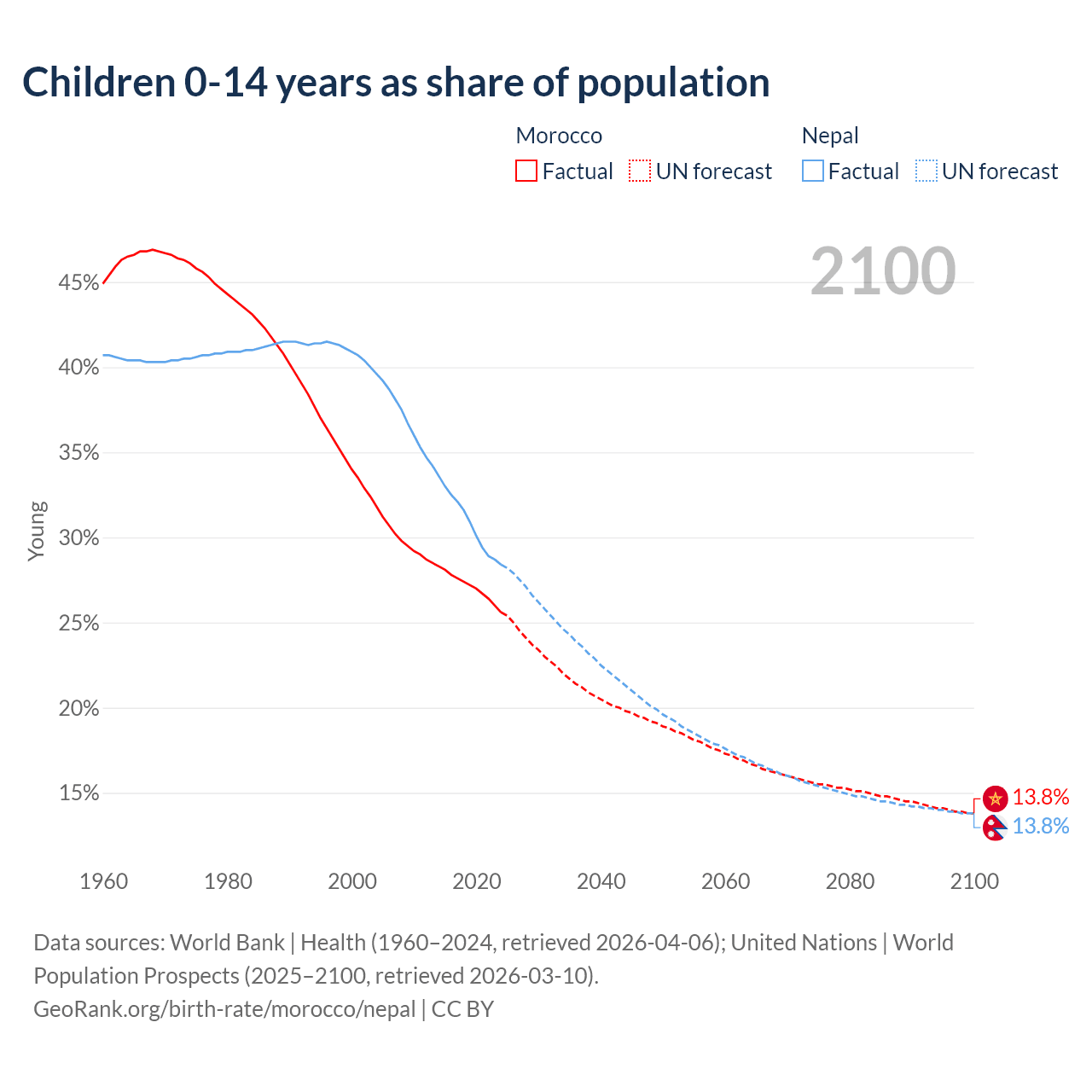 According to the latest available data on birth rates, the fertility rate in Morocco was 2.23 children per woman in 2023, compared to 1.98 in Nepal in 2023. The replacement level is considered to be 2.1 children per woman.