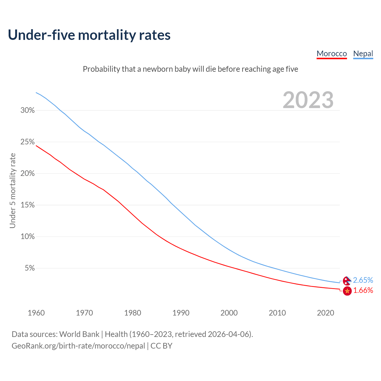 The chance that a newborn baby will die before reaching age five is 1.66% in Morocco and 2.65% in Nepal. Above is a chart with historical data on under-five mortality rates.