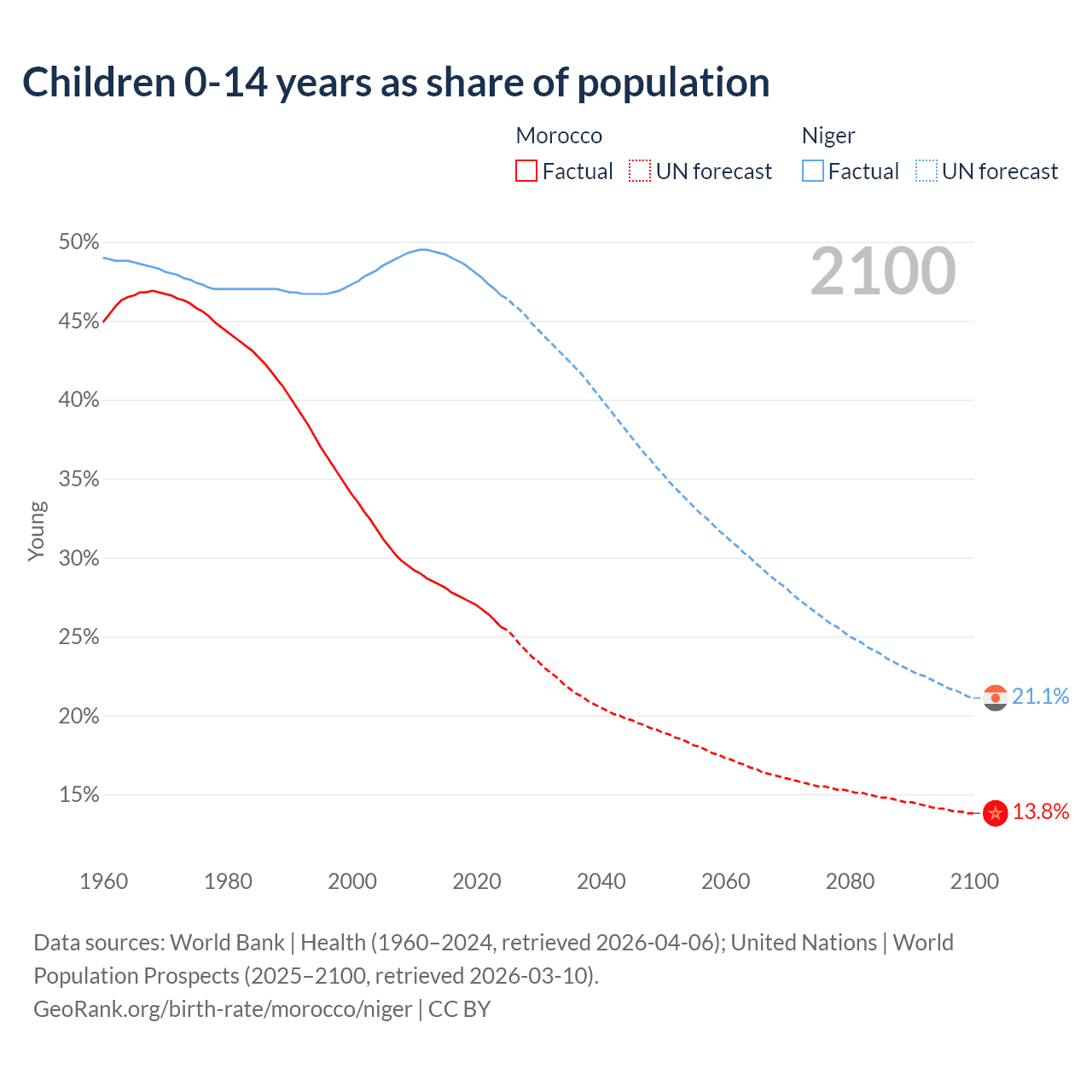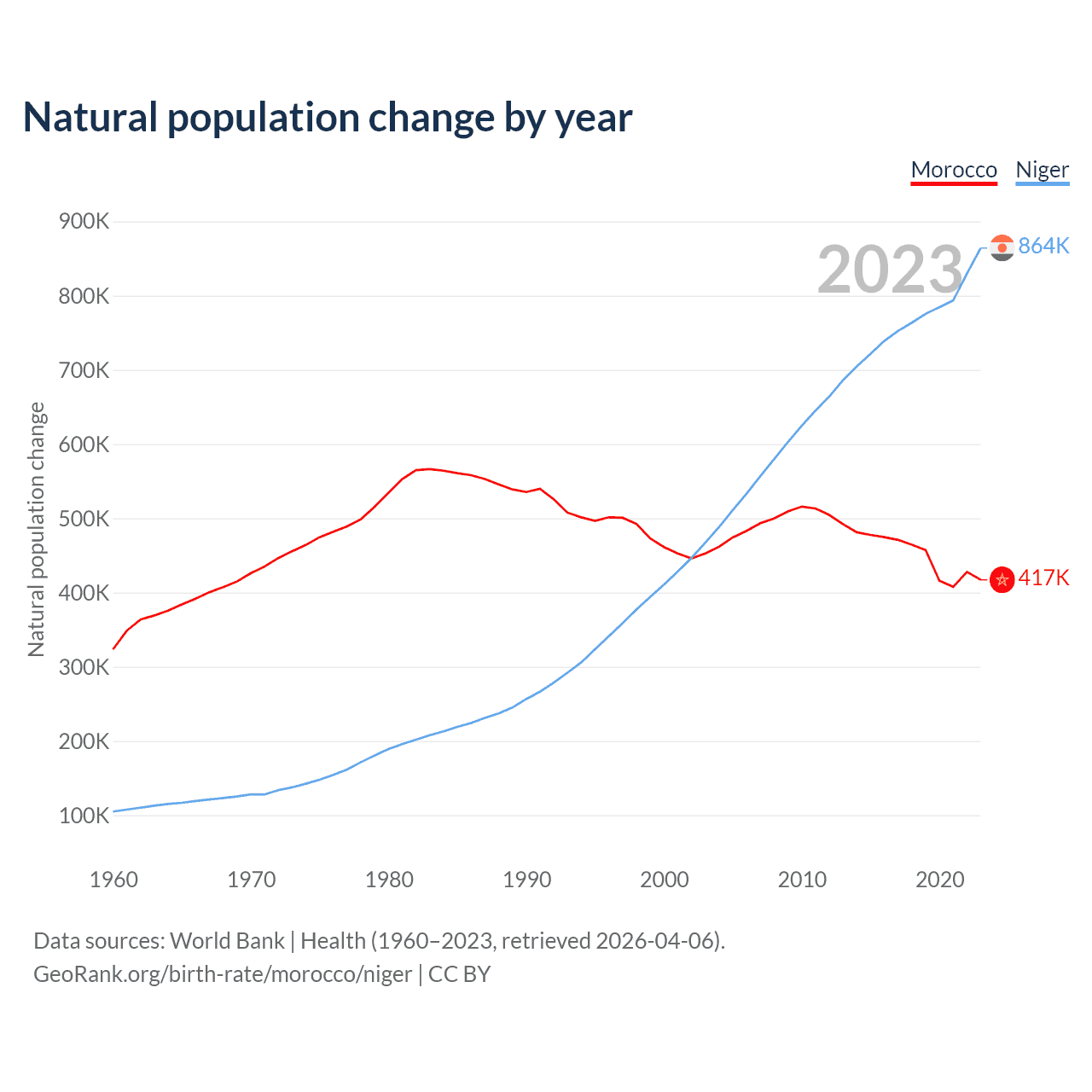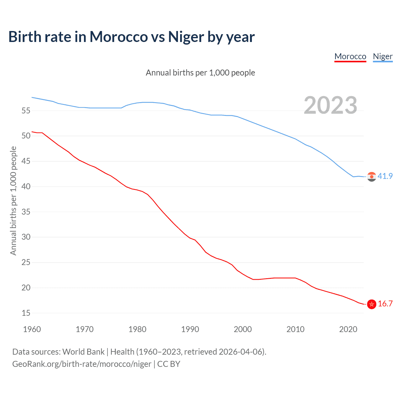 Morocco has an annual birth rate of 16.7 births per 1,000 people, compared to 41.9 for Niger. The average number of children a woman is expected to have during her lifetime — the fertility rate, is 2.23 in Morocco and 6.06 in Niger — 171.8% difference.