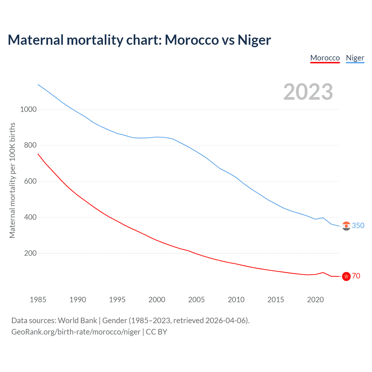 The maternal mortality rate, which is the probability of dying during childbirth or within 42 days of pregnancy termination, is 70 deaths per 100,000 live births in Morocco, compared to 350 deaths in Niger.