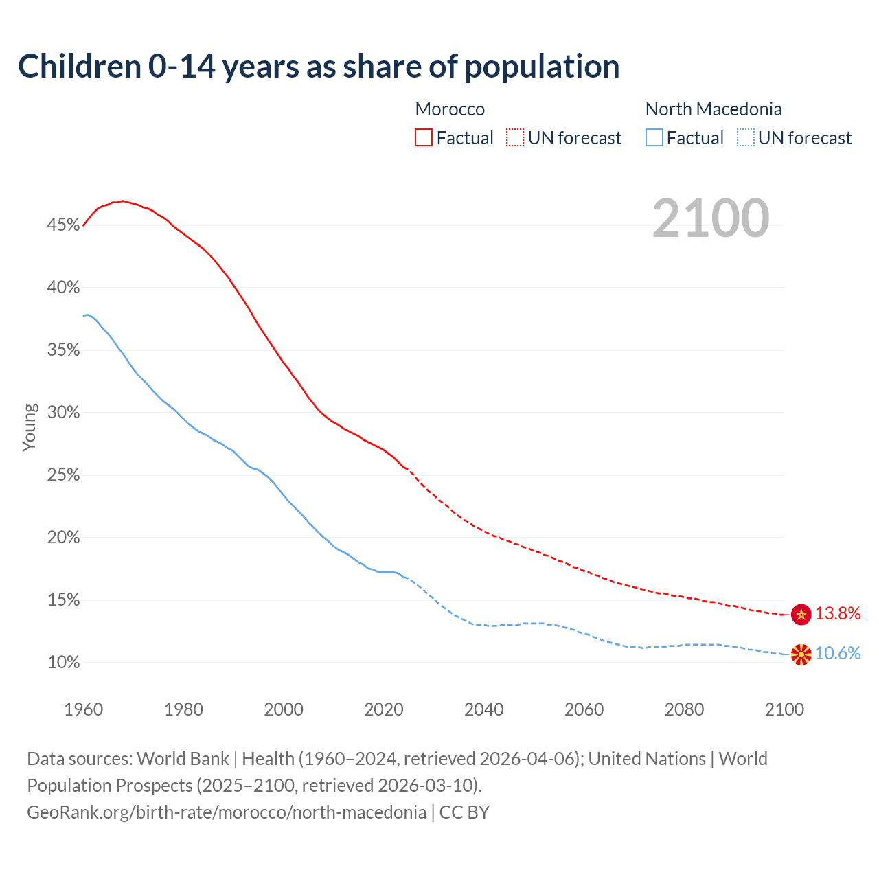 Morocco has an annual birth rate of 16.7 births per 1,000 people, compared to 9.2 for North Macedonia. The average number of children a woman is expected to have during her lifetime — the fertility rate, is 2.23 in Morocco and 1.5 in North Macedonia — 32.7% difference.