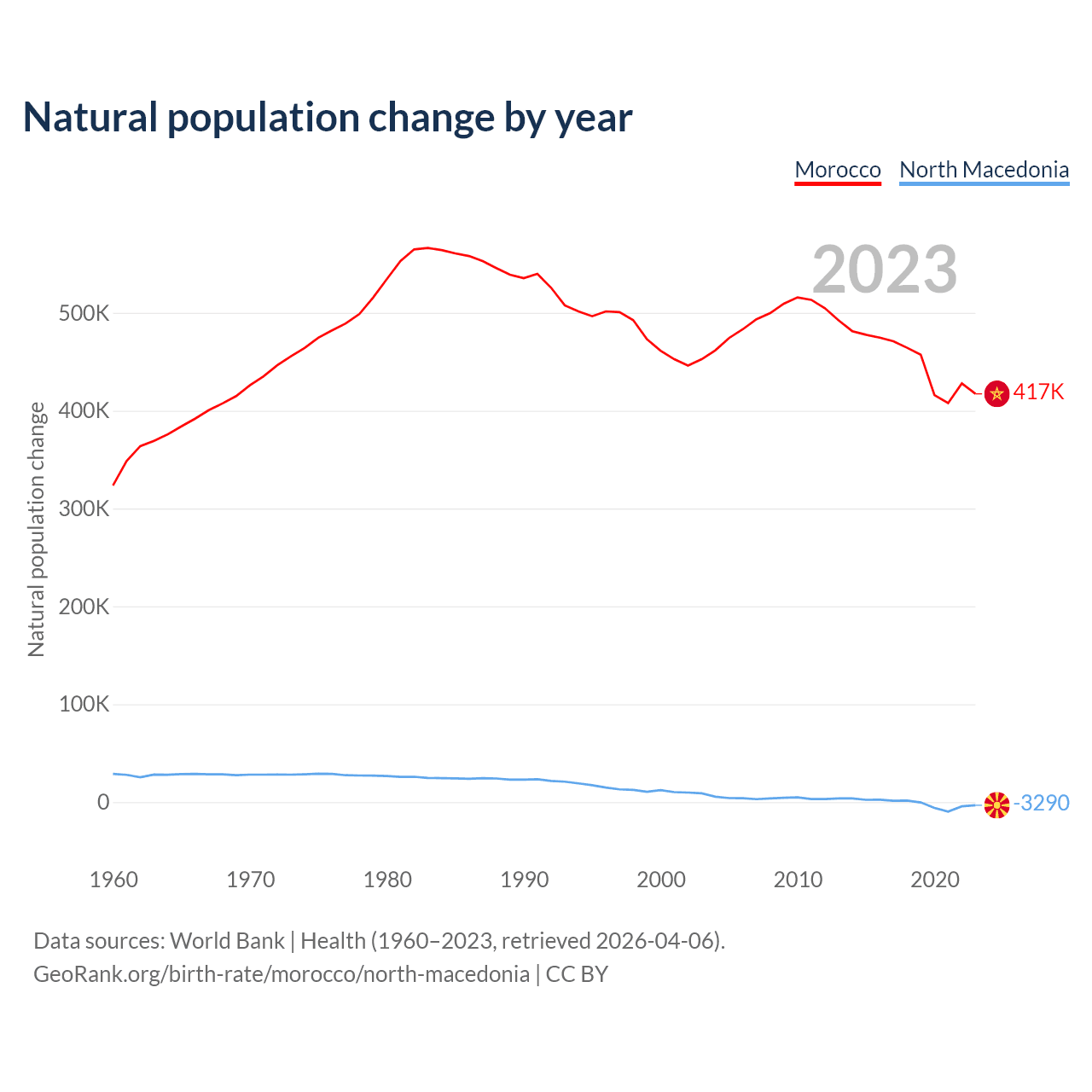 According to the latest available data on birth rates, the fertility rate in Morocco was 2.23 children per woman in 2023, compared to 1.5 in North Macedonia in 2023. The replacement level is considered to be 2.1 children per woman.