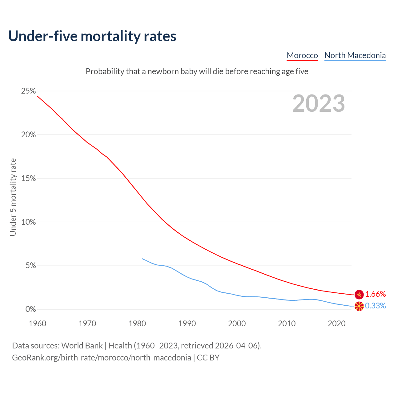 The chance that a newborn baby will die before reaching age five is 1.66% in Morocco and 0.33% in North Macedonia. Above is a chart with historical data on under-five mortality rates.