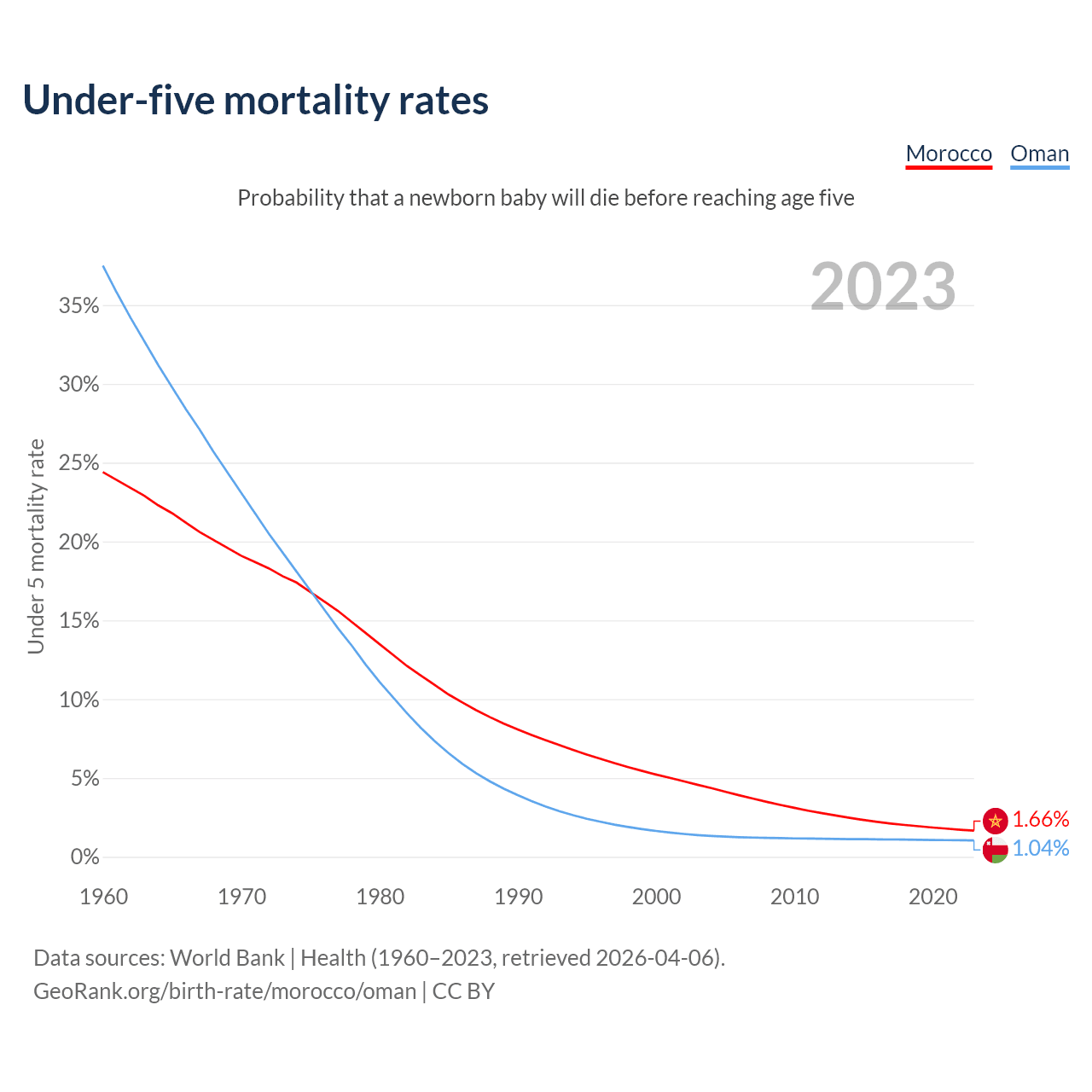 The chance that a newborn baby will die before reaching age five is 1.66% in Morocco and 1.04% in Oman. Above is a chart with historical data on under-five mortality rates.