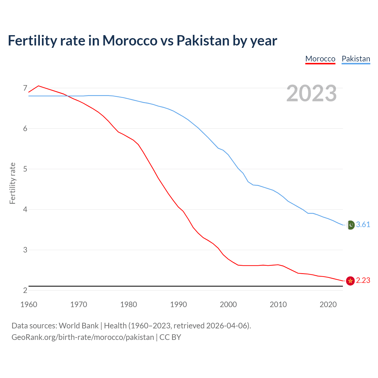 According to the latest available data on birth rates, the fertility rate in Morocco was 2.23 children per woman in 2023, compared to 3.61 in Pakistan in 2023. The replacement level is considered to be 2.1 children per woman.