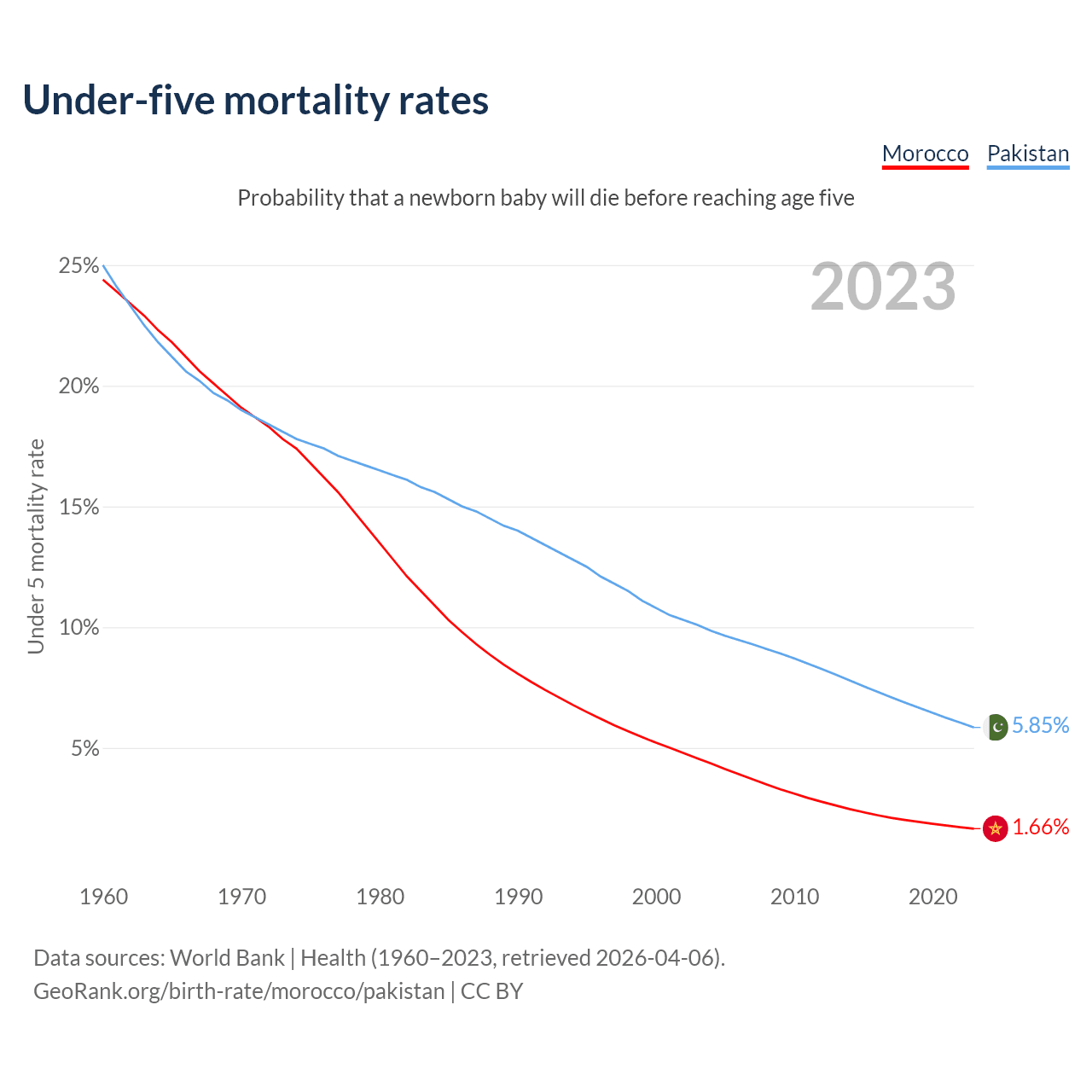 The chance that a newborn baby will die before reaching age five is 1.66% in Morocco and 5.85% in Pakistan. Above is a chart with historical data on under-five mortality rates.