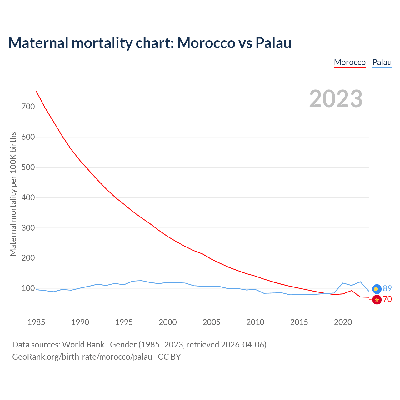 The maternal mortality rate, which is the probability of dying during childbirth or within 42 days of pregnancy termination, is 70 deaths per 100,000 live births in Morocco, compared to 89 deaths in Palau.
