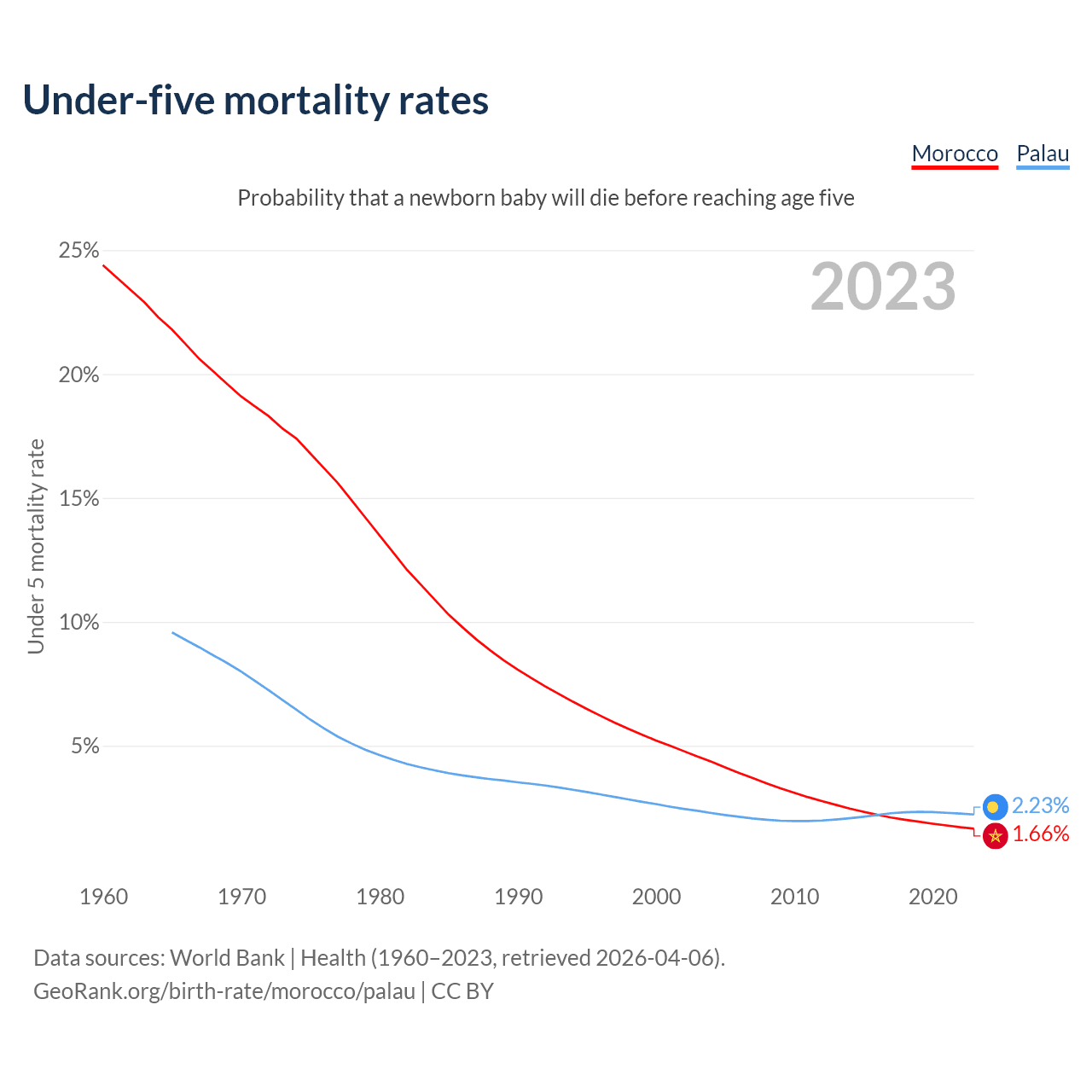 The chance that a newborn baby will die before reaching age five is 1.66% in Morocco and 2.23% in Palau. Above is a chart with historical data on under-five mortality rates.