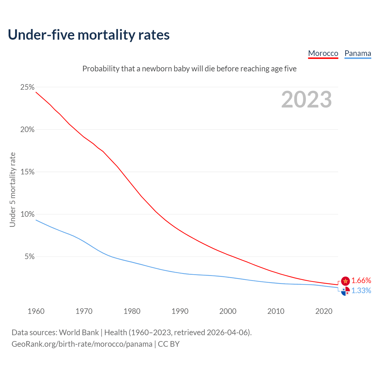 The chance that a newborn baby will die before reaching age five is 1.66% in Morocco and 1.33% in Panama. Above is a chart with historical data on under-five mortality rates.
