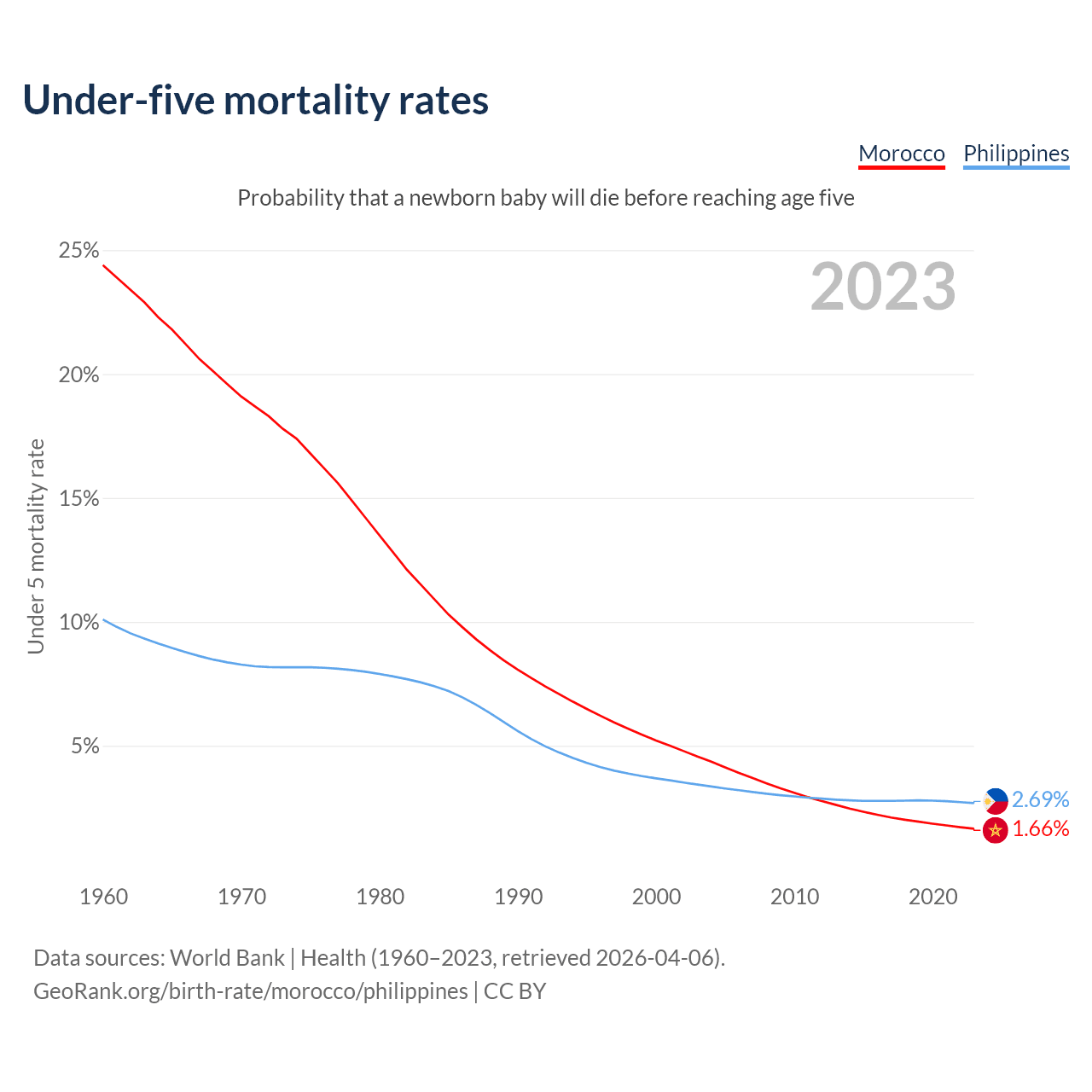 The chance that a newborn baby will die before reaching age five is 1.66% in Morocco and 2.69% in the Philippines. Above is a chart with historical data on under-five mortality rates.