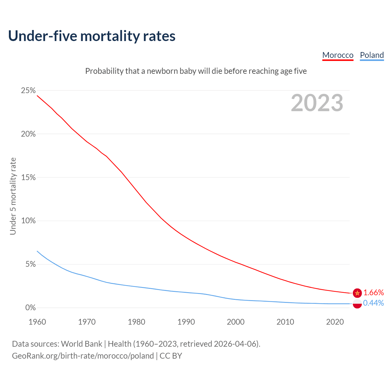 The chance that a newborn baby will die before reaching age five is 1.66% in Morocco and 0.44% in Poland. Above is a chart with historical data on under-five mortality rates.