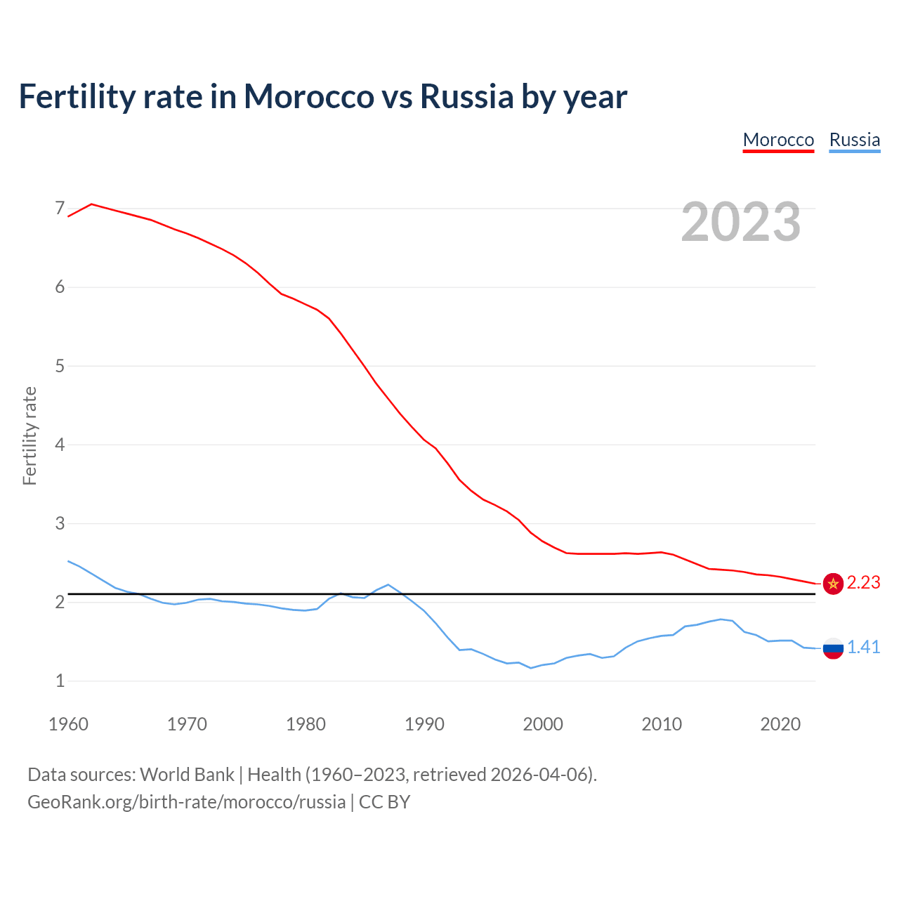 1960 vs 2023, the fertility rate has decreased by 67.6% in Morocco and by 44% in Russia — in 1960, it was 6.89 and 2.52, respectively.
