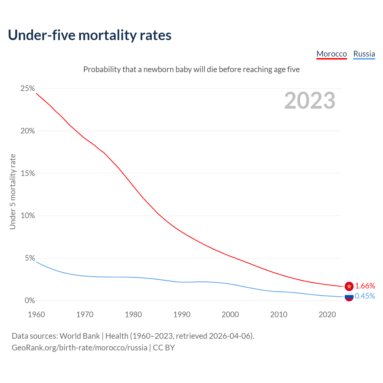 The chance that a newborn baby will die before reaching age five is 1.66% in Morocco and 0.45% in Russia. Above is a chart with historical data on under-five mortality rates.
