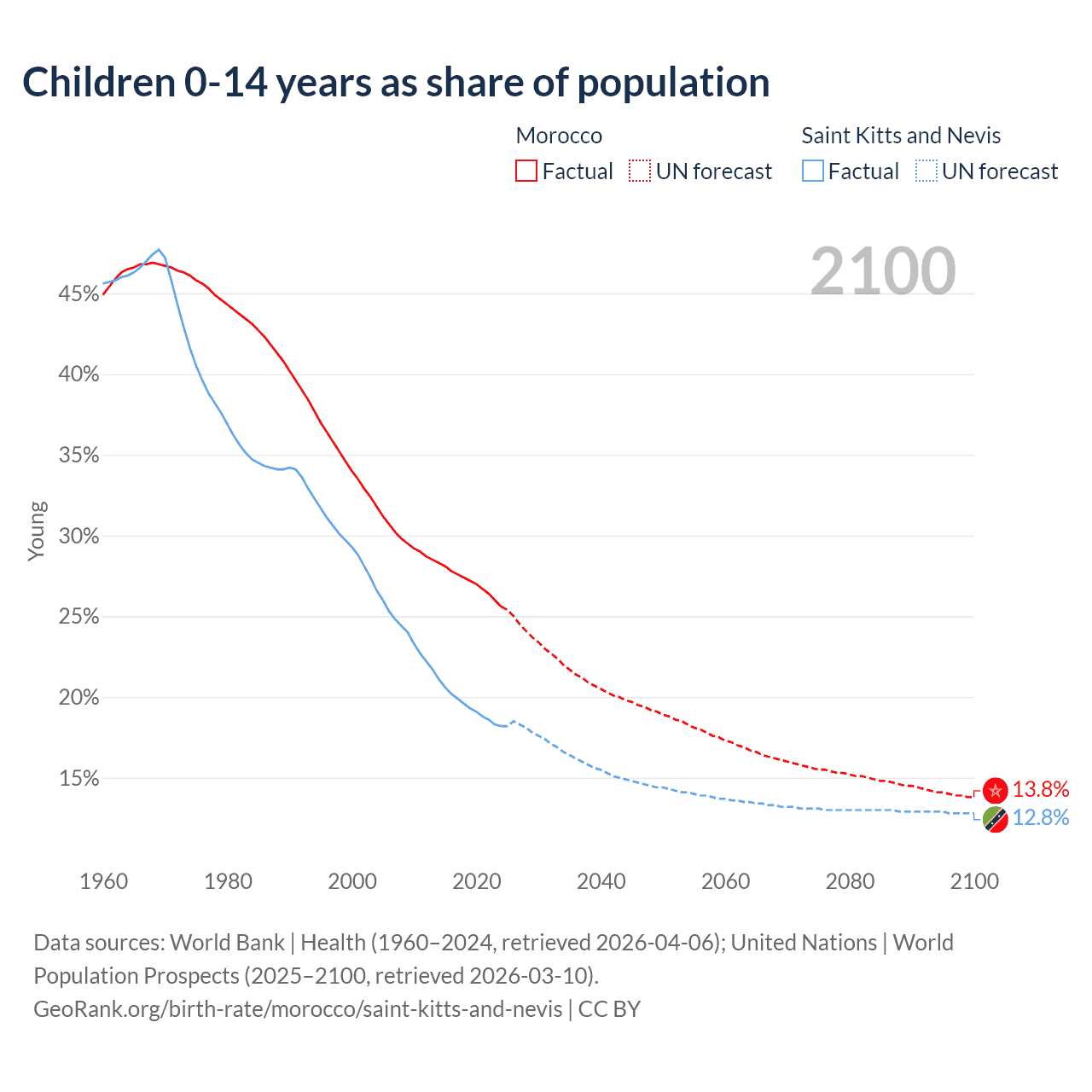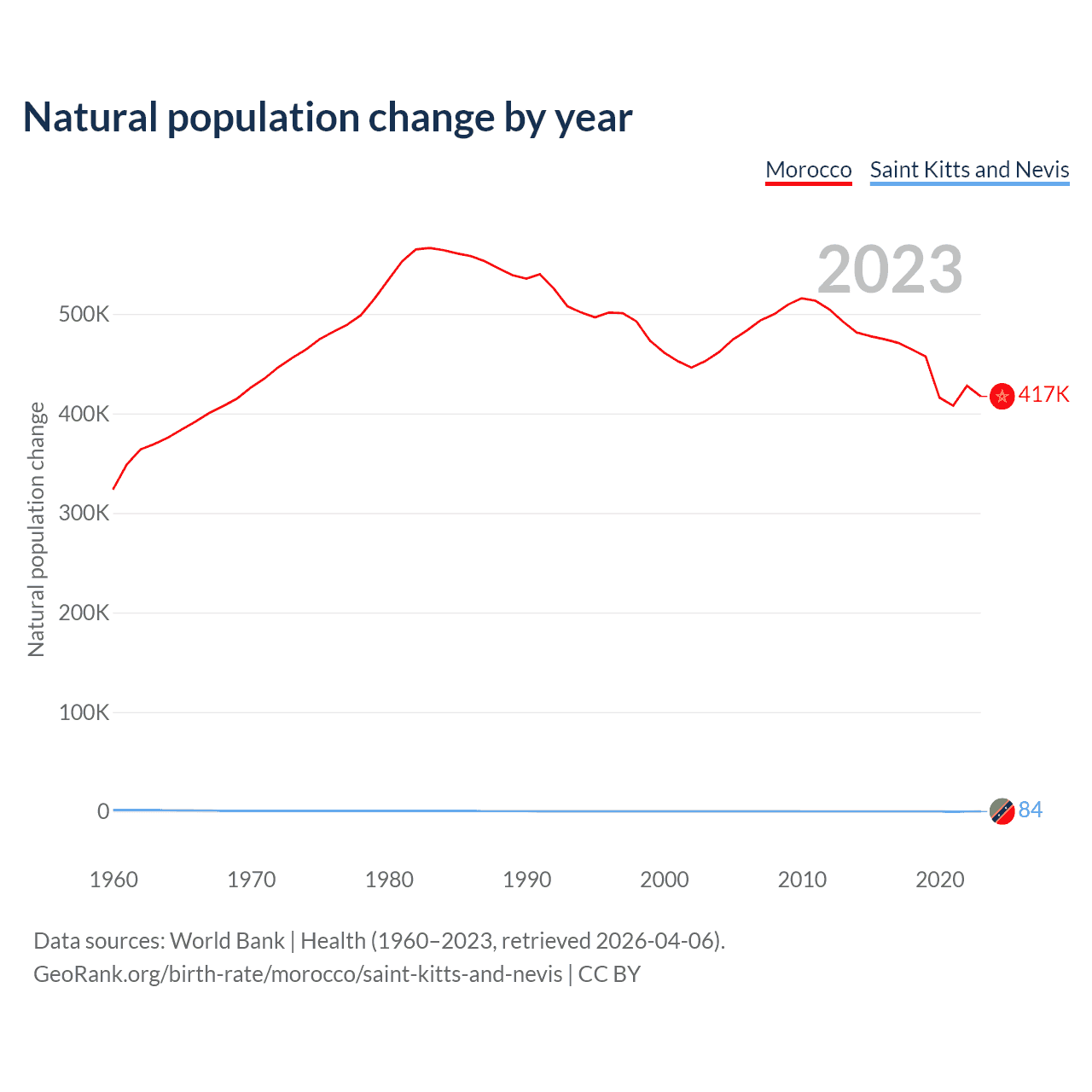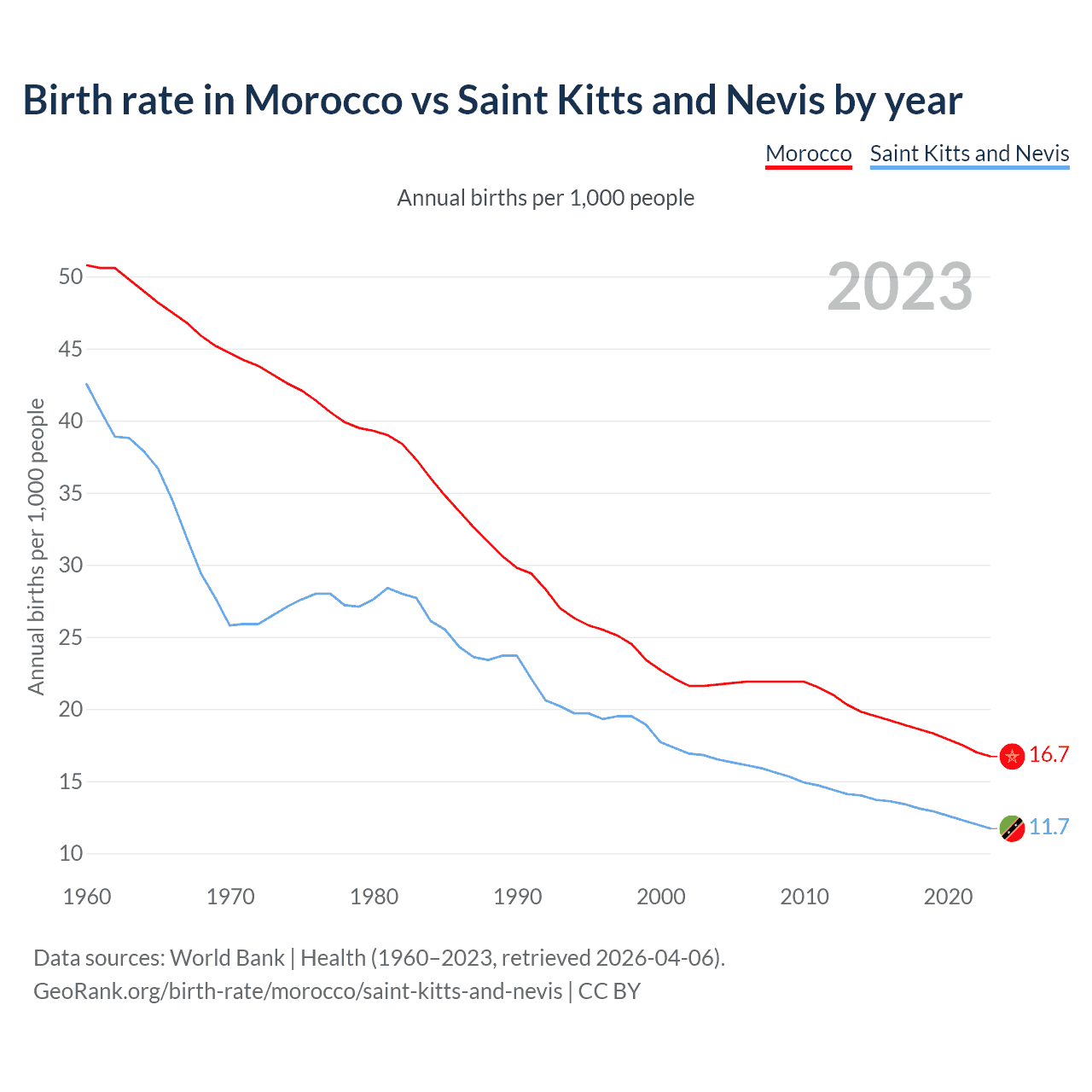 Morocco has an annual birth rate of 16.7 births per 1,000 people, compared to 11.7 for Saint Kitts and Nevis. The average number of children a woman is expected to have during her lifetime — the fertility rate, is 2.23 in Morocco and 1.51 in Saint Kitts and Nevis — 32.5% difference.