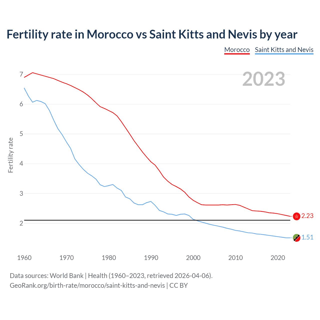 According to the latest available data on birth rates, the fertility rate in Morocco was 2.23 children per woman in 2023, compared to 1.51 in Saint Kitts and Nevis in 2023. The replacement level is considered to be 2.1 children per woman.