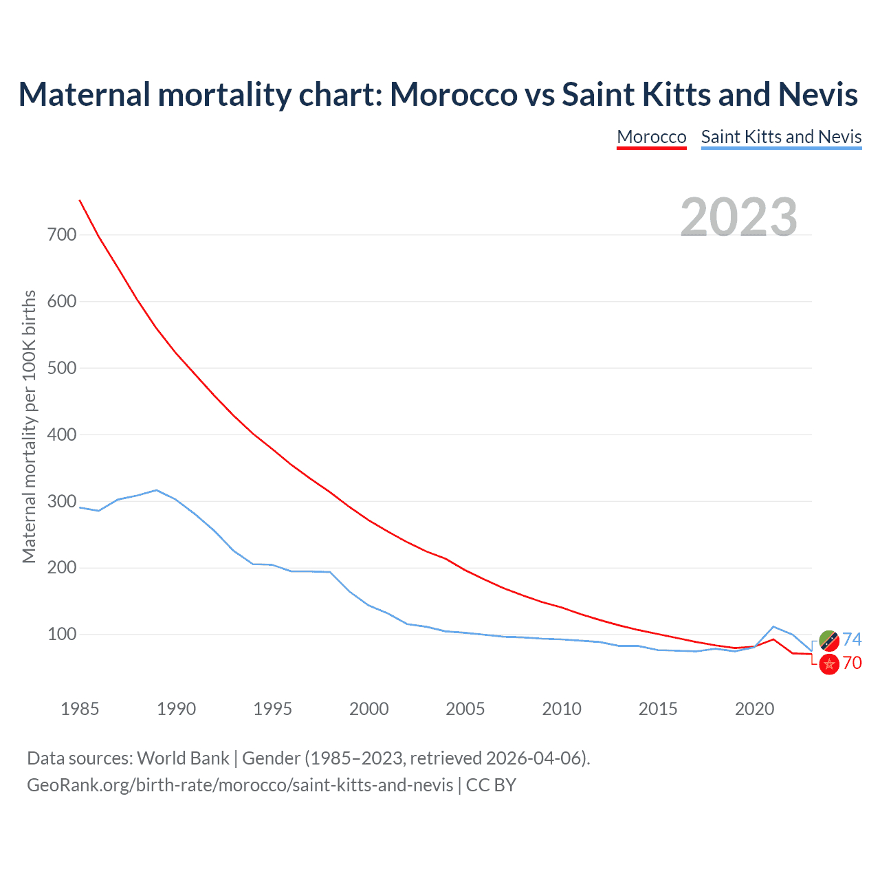 The maternal mortality rate, which is the probability of dying during childbirth or within 42 days of pregnancy termination, is 70 deaths per 100,000 live births in Morocco, compared to 74 deaths in Saint Kitts and Nevis.