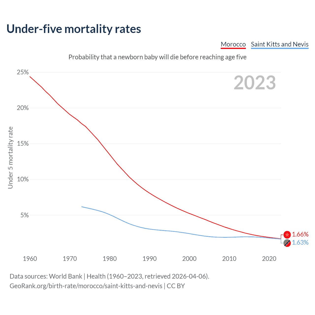 The chance that a newborn baby will die before reaching age five is 1.66% in Morocco and 1.63% in Saint Kitts and Nevis. Above is a chart with historical data on under-five mortality rates.