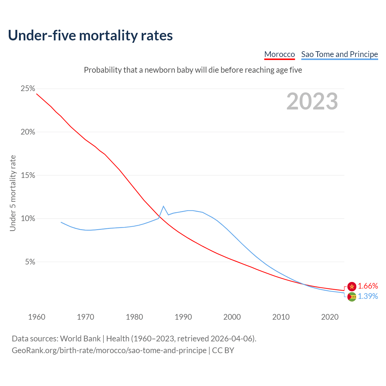 The chance that a newborn baby will die before reaching age five is 1.66% in Morocco and 1.39% in Sao Tome and Principe. Above is a chart with historical data on under-five mortality rates.