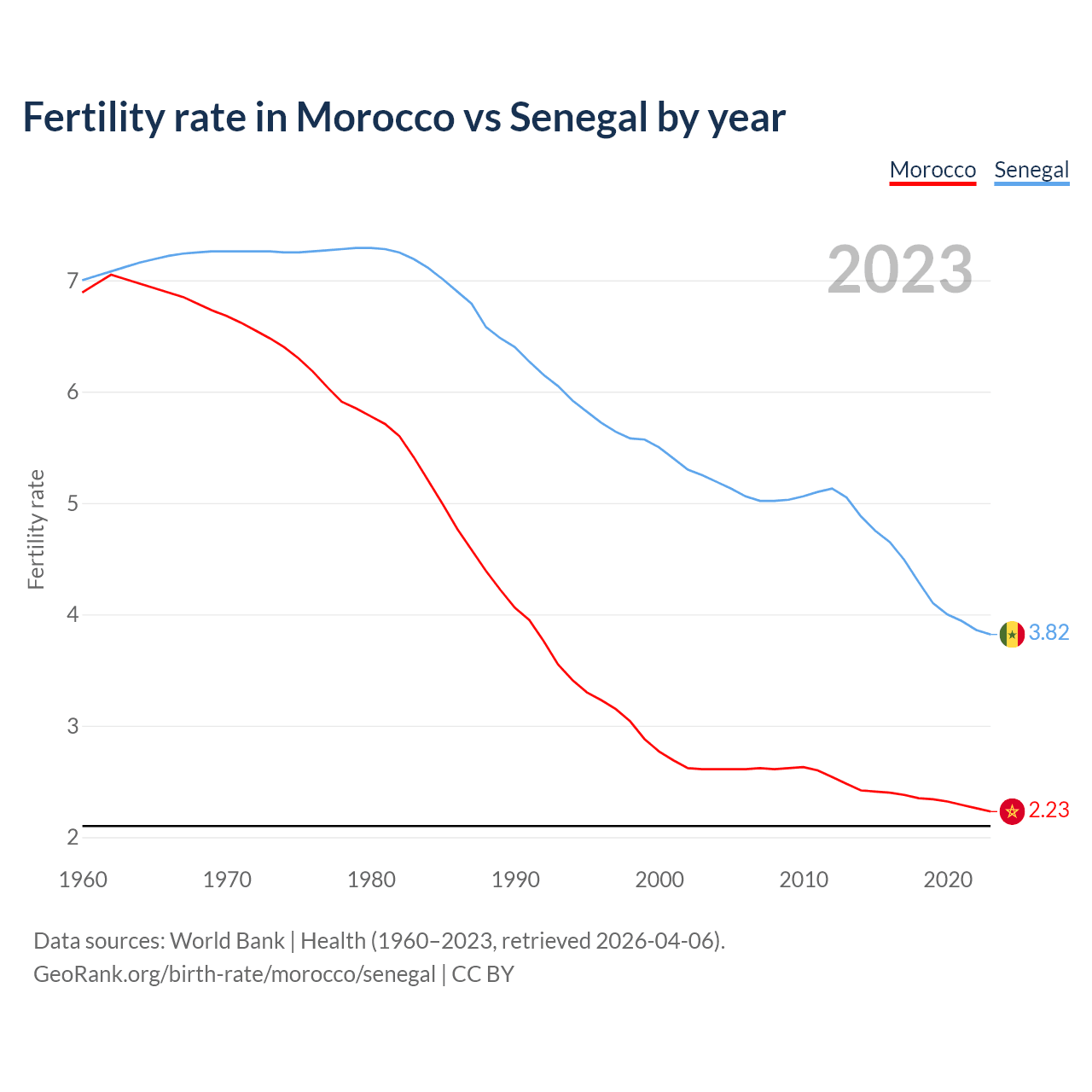 1960 vs 2023, the fertility rate has decreased by 67.6% in Morocco and by 45.4% in Senegal — in 1960, it was 6.89 and 7, respectively.