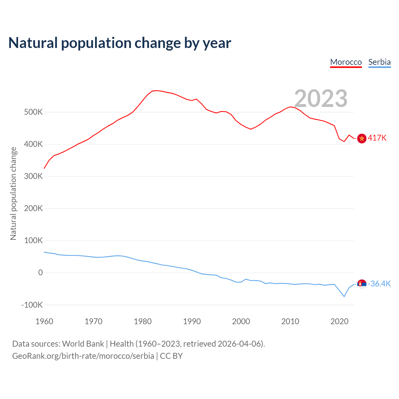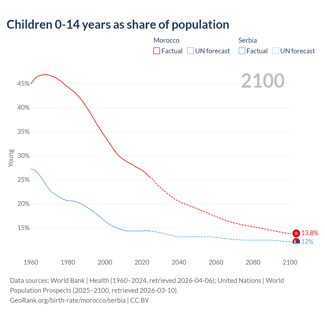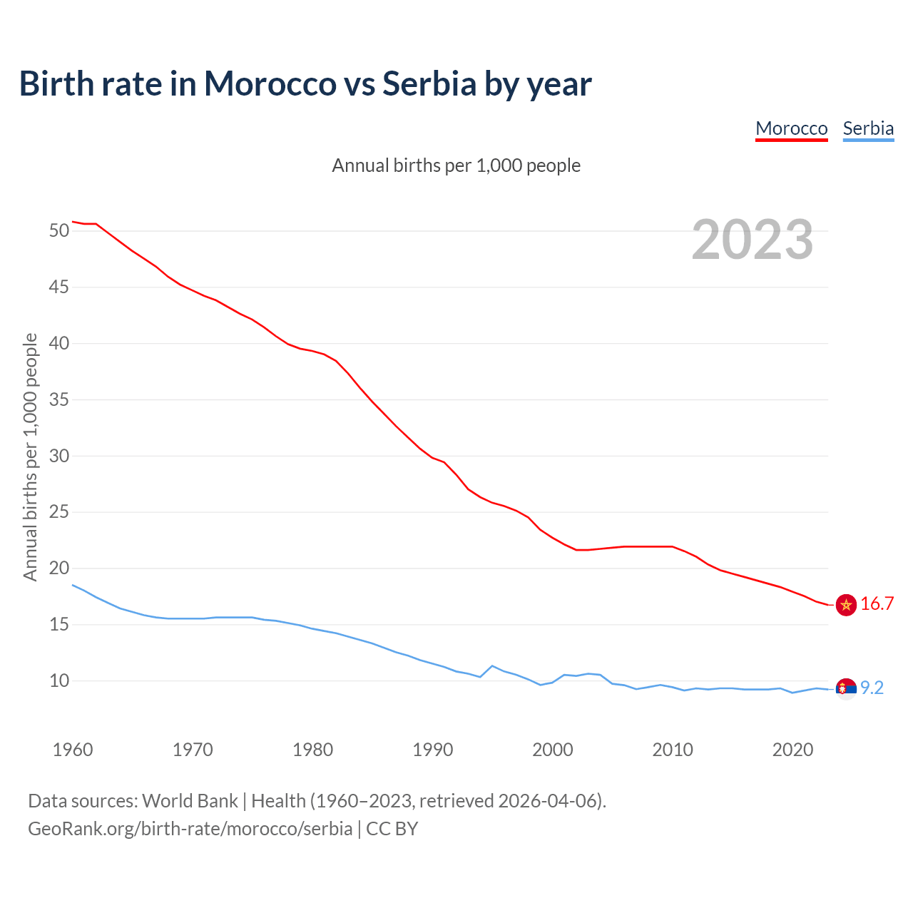 Morocco has an annual birth rate of 16.7 births per 1,000 people, compared to 9.2 for Serbia. The average number of children a woman is expected to have during her lifetime — the fertility rate, is 2.23 in Morocco and 1.61 in Serbia — 27.8% difference.