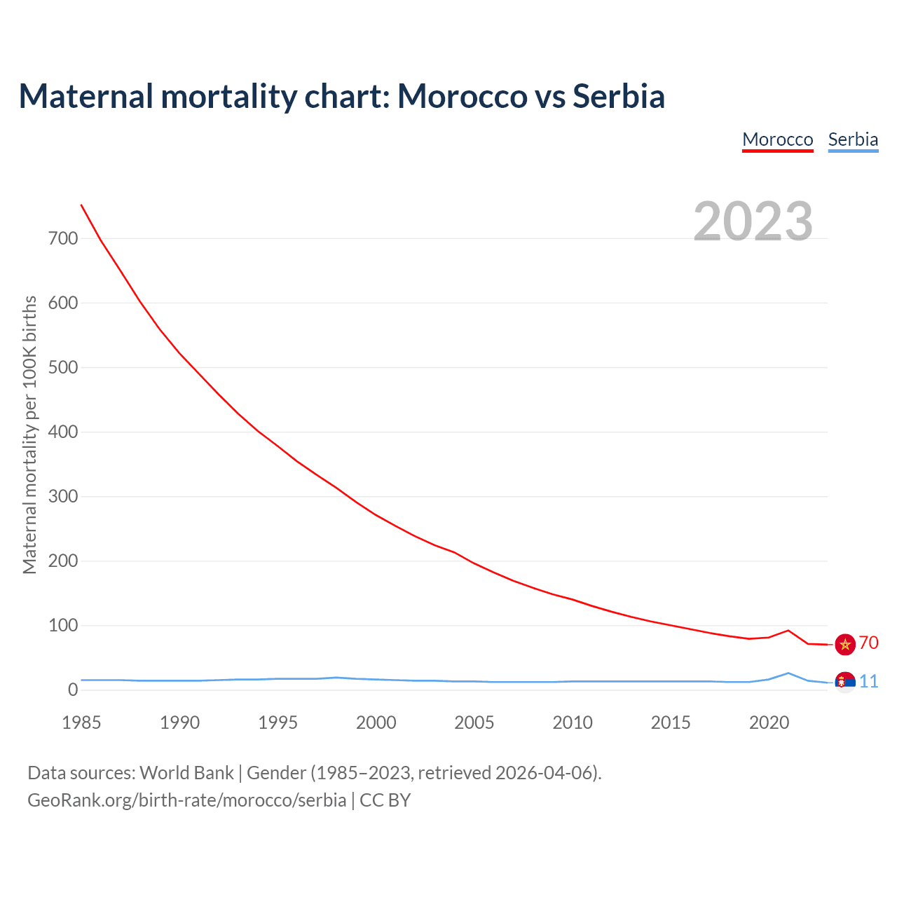 The maternal mortality rate, which is the probability of dying during childbirth or within 42 days of pregnancy termination, is 70 deaths per 100,000 live births in Morocco, compared to 11 deaths in Serbia.