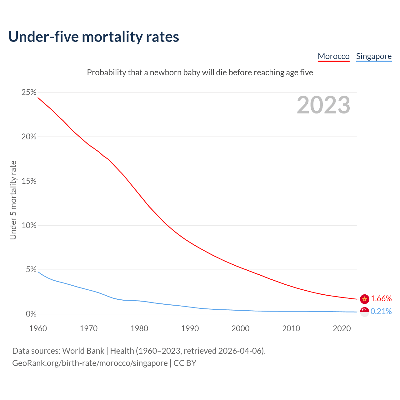 The chance that a newborn baby will die before reaching age five is 1.66% in Morocco and 0.21% in Singapore. Above is a chart with historical data on under-five mortality rates.