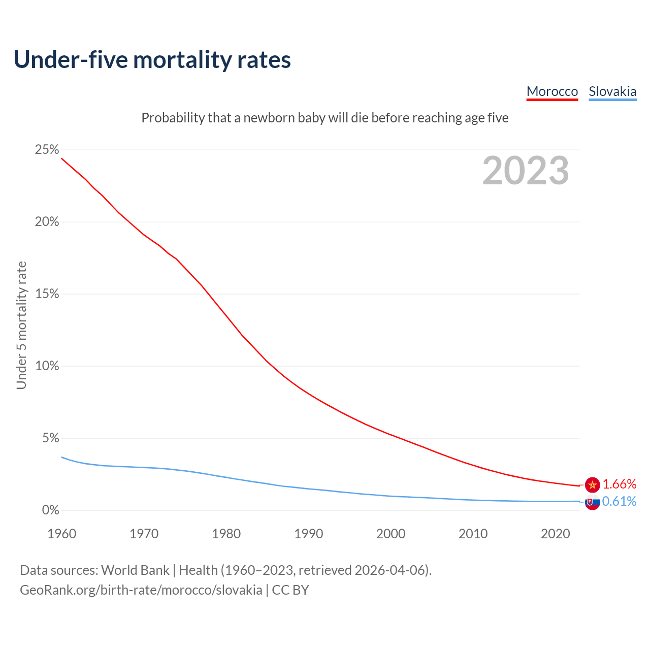 The chance that a newborn baby will die before reaching age five is 1.66% in Morocco and 0.61% in Slovakia. Above is a chart with historical data on under-five mortality rates.