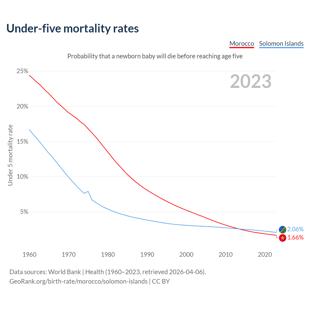 The chance that a newborn baby will die before reaching age five is 1.66% in Morocco and 2.06% in the Solomon Islands. Above is a chart with historical data on under-five mortality rates.
