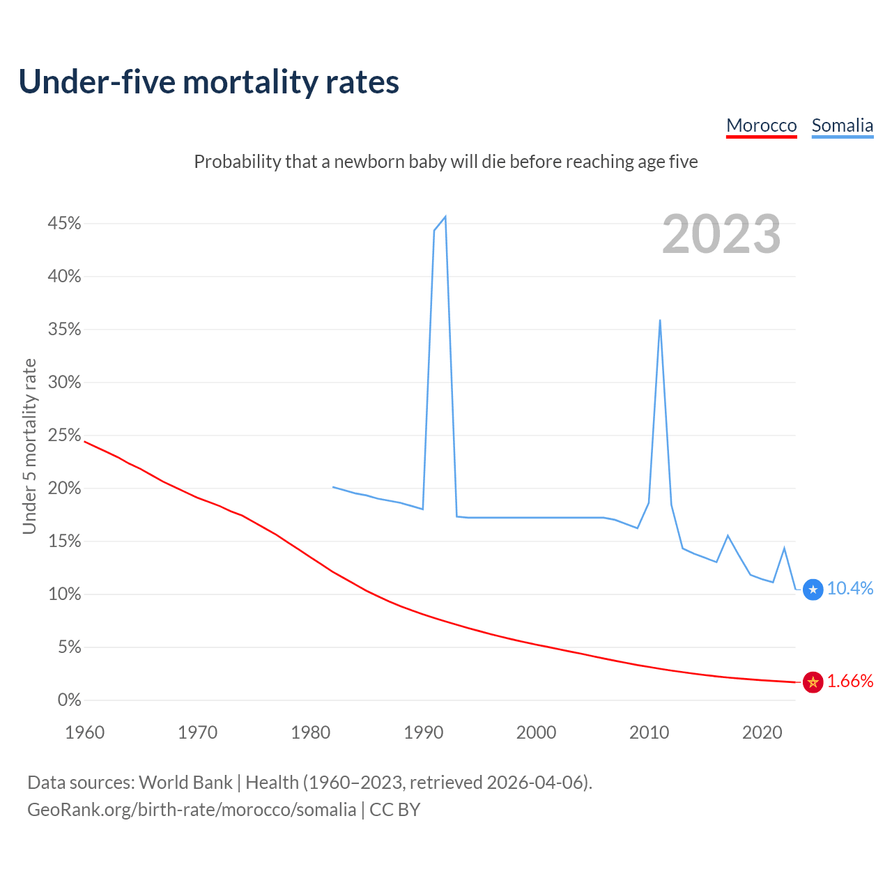 The chance that a newborn baby will die before reaching age five is 1.66% in Morocco and 10.4% in Somalia. Above is a chart with historical data on under-five mortality rates.