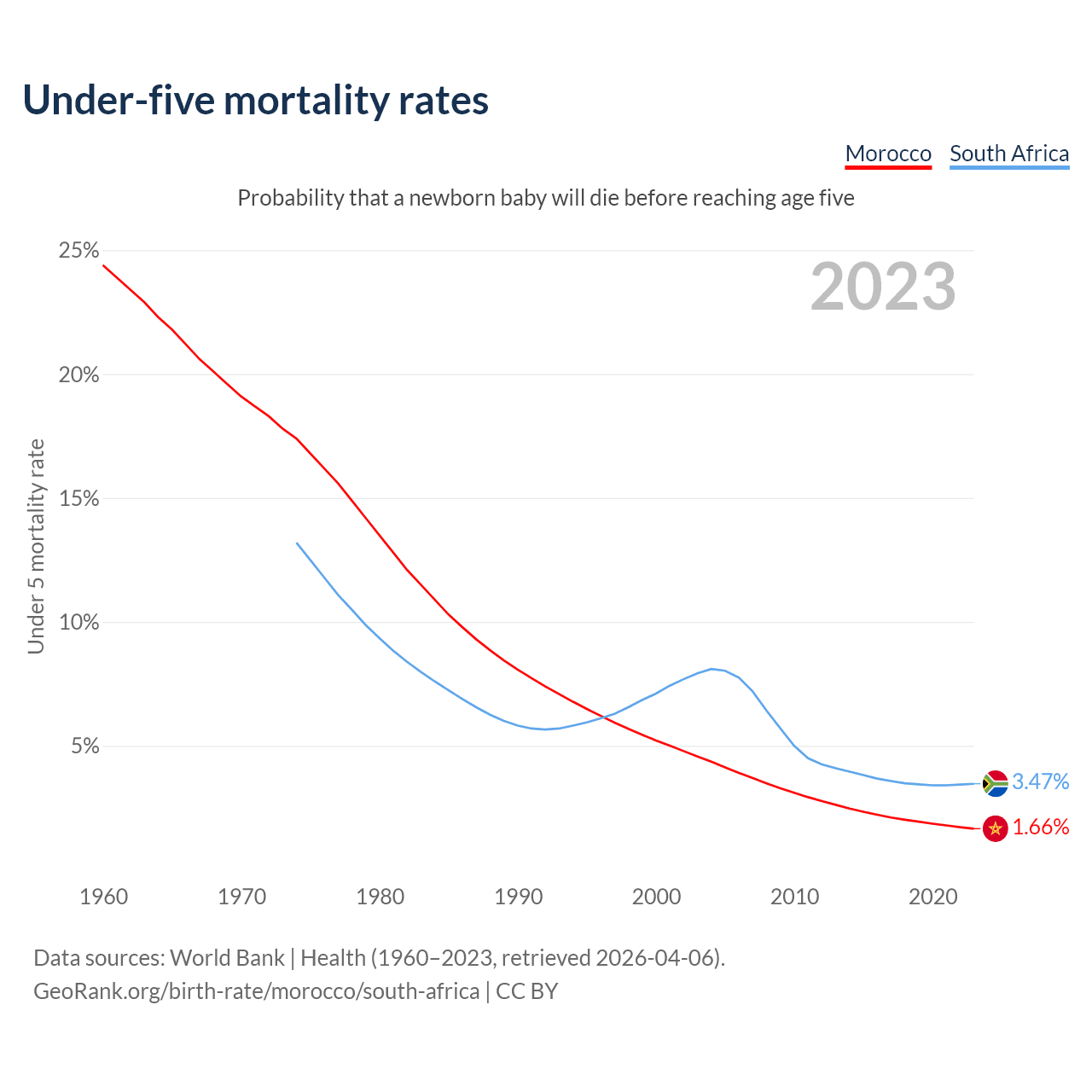 The chance that a newborn baby will die before reaching age five is 1.66% in Morocco and 3.47% in South Africa. Above is a chart with historical data on under-five mortality rates.