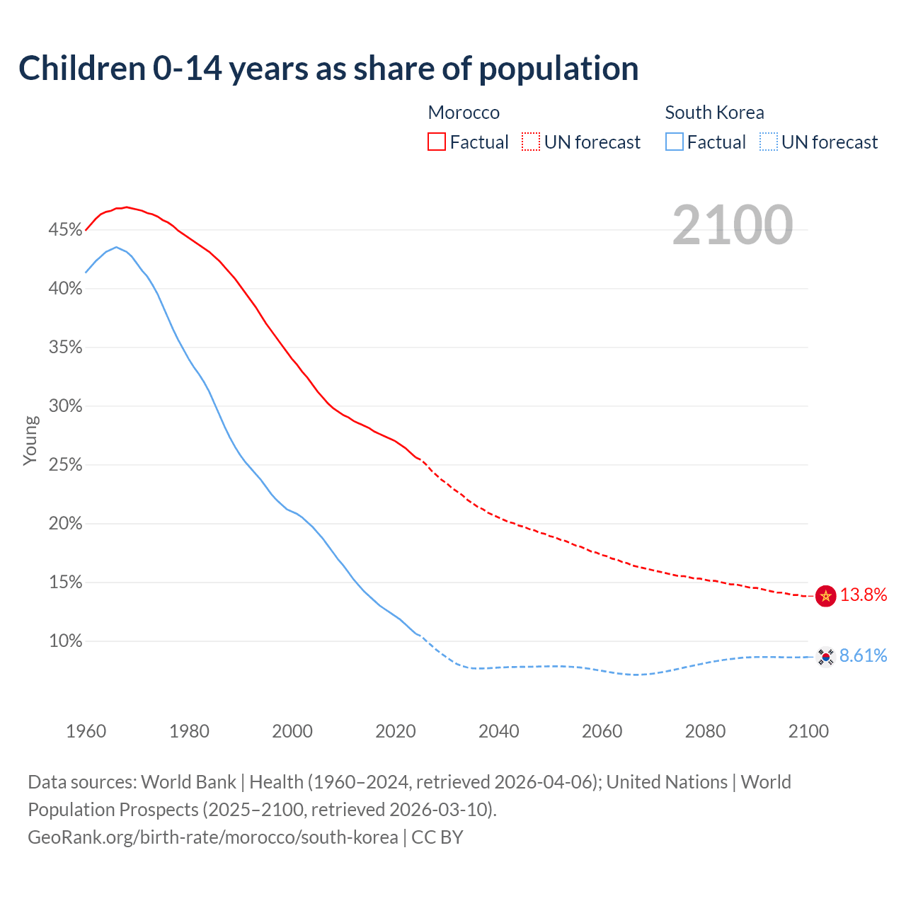 Morocco has an annual birth rate of 16.7 births per 1,000 people, compared to 4.5 for South Korea. The average number of children a woman is expected to have during her lifetime — the fertility rate, is 2.23 in Morocco and 0.72 in South Korea — 67.7% difference.