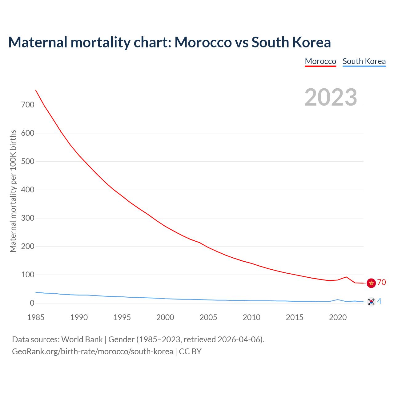 The maternal mortality rate, which is the probability of dying during childbirth or within 42 days of pregnancy termination, is 70 deaths per 100,000 live births in Morocco, compared to 4 deaths in South Korea.