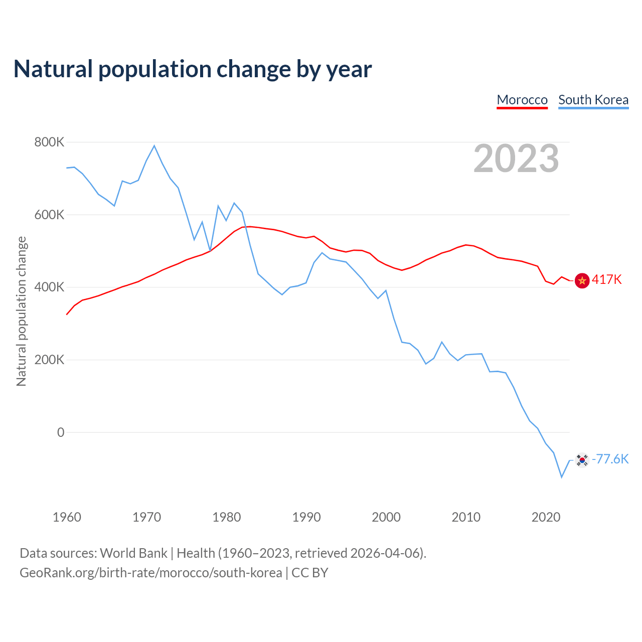According to the latest available data on birth rates, the fertility rate in Morocco was 2.23 children per woman in 2023, compared to 0.72 in South Korea in 2023. The replacement level is considered to be 2.1 children per woman.
