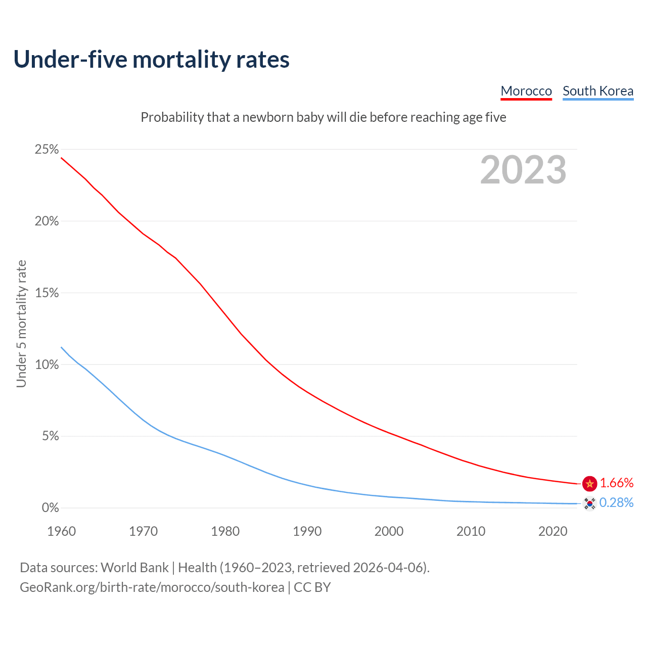 The chance that a newborn baby will die before reaching age five is 1.66% in Morocco and 0.28% in South Korea. Above is a chart with historical data on under-five mortality rates.
