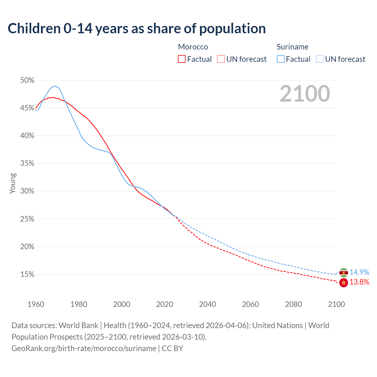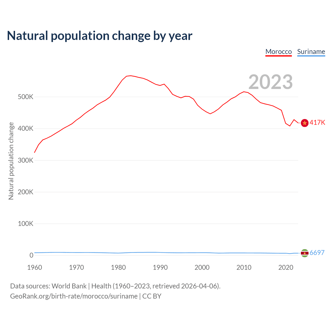 According to the latest available data on birth rates, the fertility rate in Morocco was 2.23 children per woman in 2023, compared to 2.25 in Suriname in 2023. The replacement level is considered to be 2.1 children per woman.