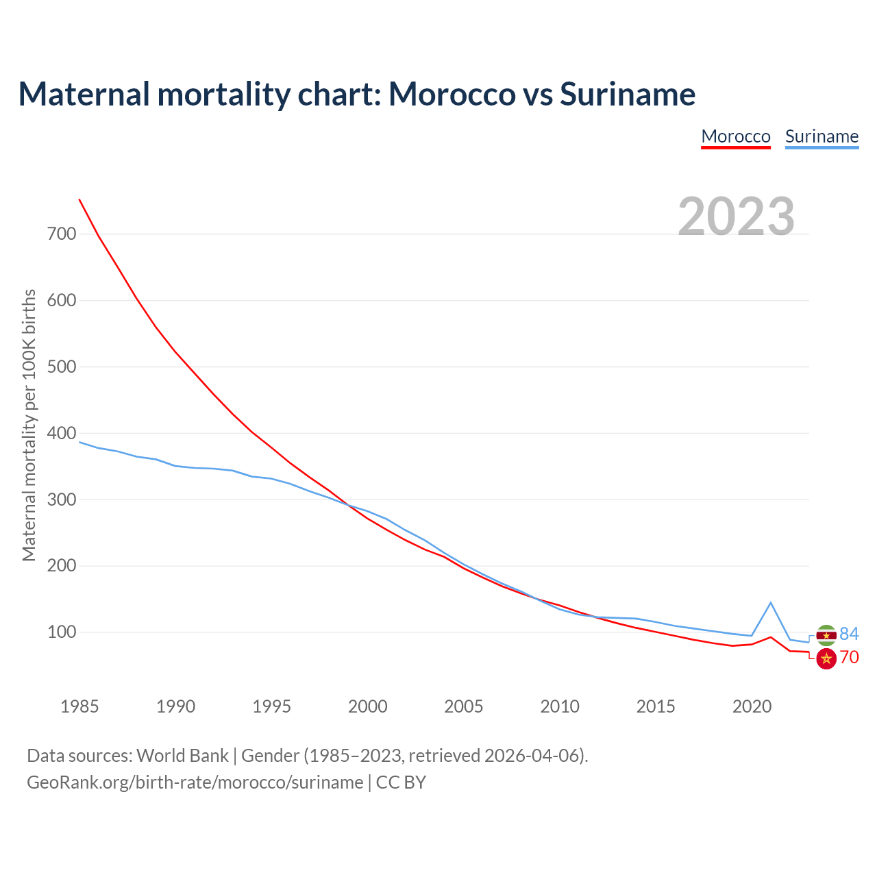 The maternal mortality rate, which is the probability of dying during childbirth or within 42 days of pregnancy termination, is 70 deaths per 100,000 live births in Morocco, compared to 84 deaths in Suriname.
