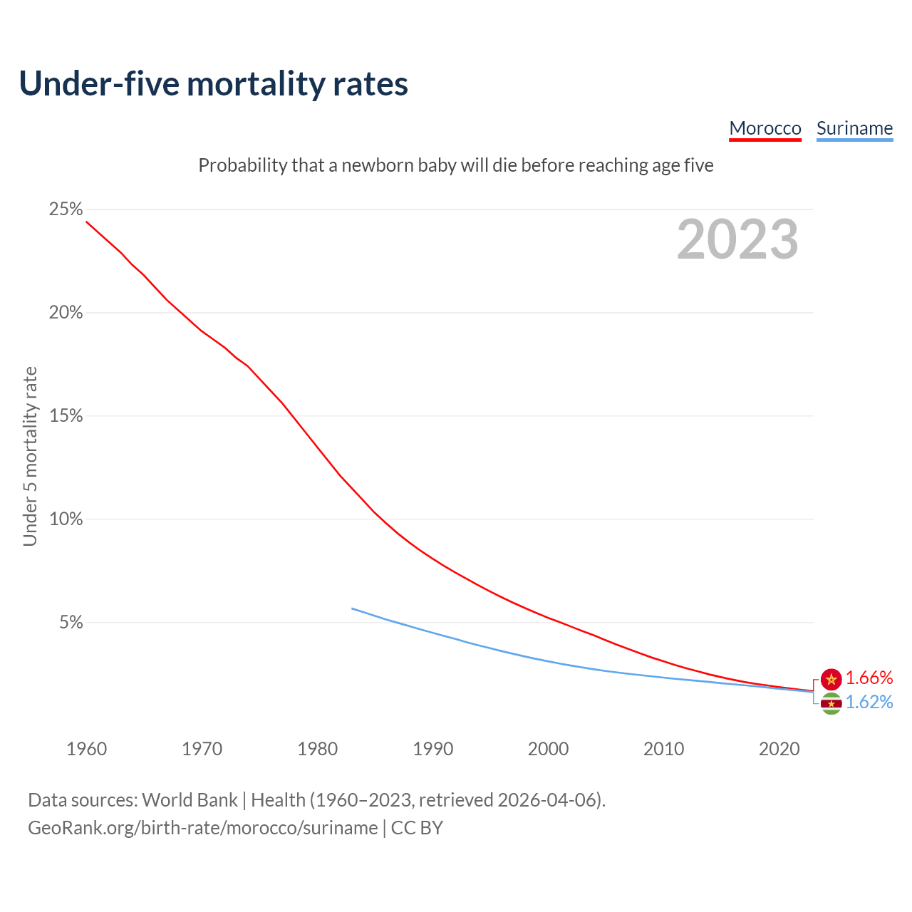 The chance that a newborn baby will die before reaching age five is 1.66% in Morocco and 1.62% in Suriname. Above is a chart with historical data on under-five mortality rates.