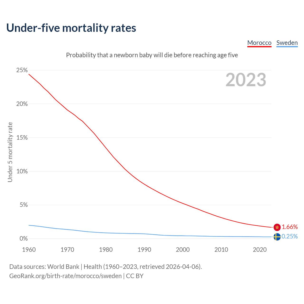 The chance that a newborn baby will die before reaching age five is 1.66% in Morocco and 0.25% in Sweden. Above is a chart with historical data on under-five mortality rates.