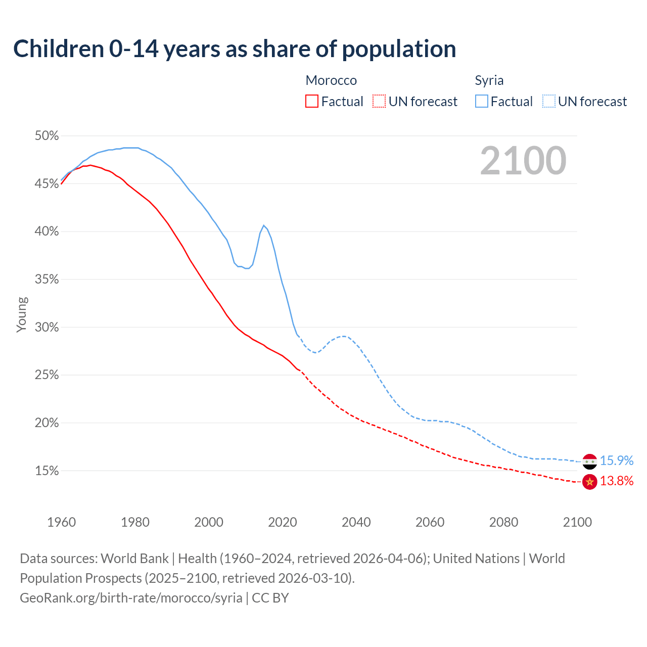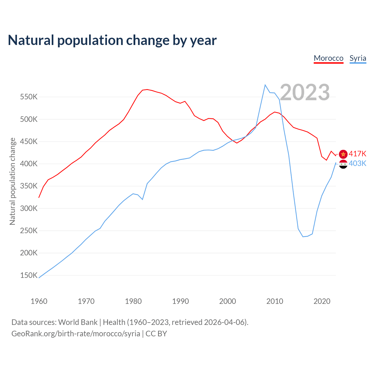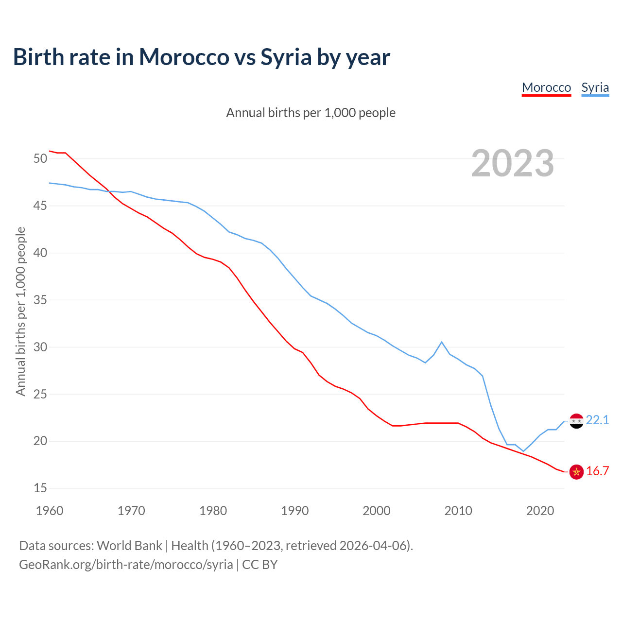 Morocco has an annual birth rate of 16.7 births per 1,000 people, compared to 22.1 for Syria. The average number of children a woman is expected to have during her lifetime — the fertility rate, is 2.23 in Morocco and 2.71 in Syria — 21.6% difference.