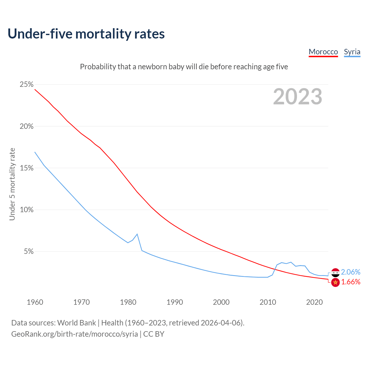 The chance that a newborn baby will die before reaching age five is 1.66% in Morocco and 2.06% in Syria. Above is a chart with historical data on under-five mortality rates.
