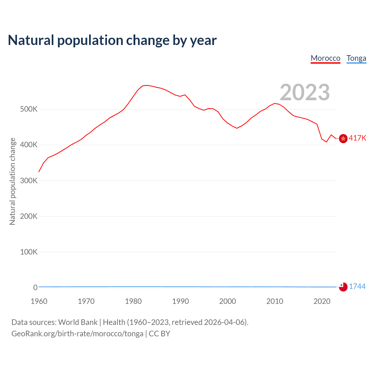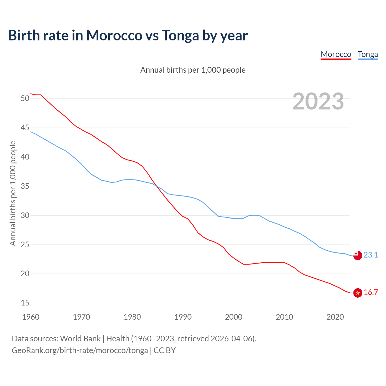 Morocco has an annual birth rate of 16.7 births per 1,000 people, compared to 23.1 for Tonga. The average number of children a woman is expected to have during her lifetime — the fertility rate, is 2.23 in Morocco and 3.13 in Tonga — 40.3% difference.