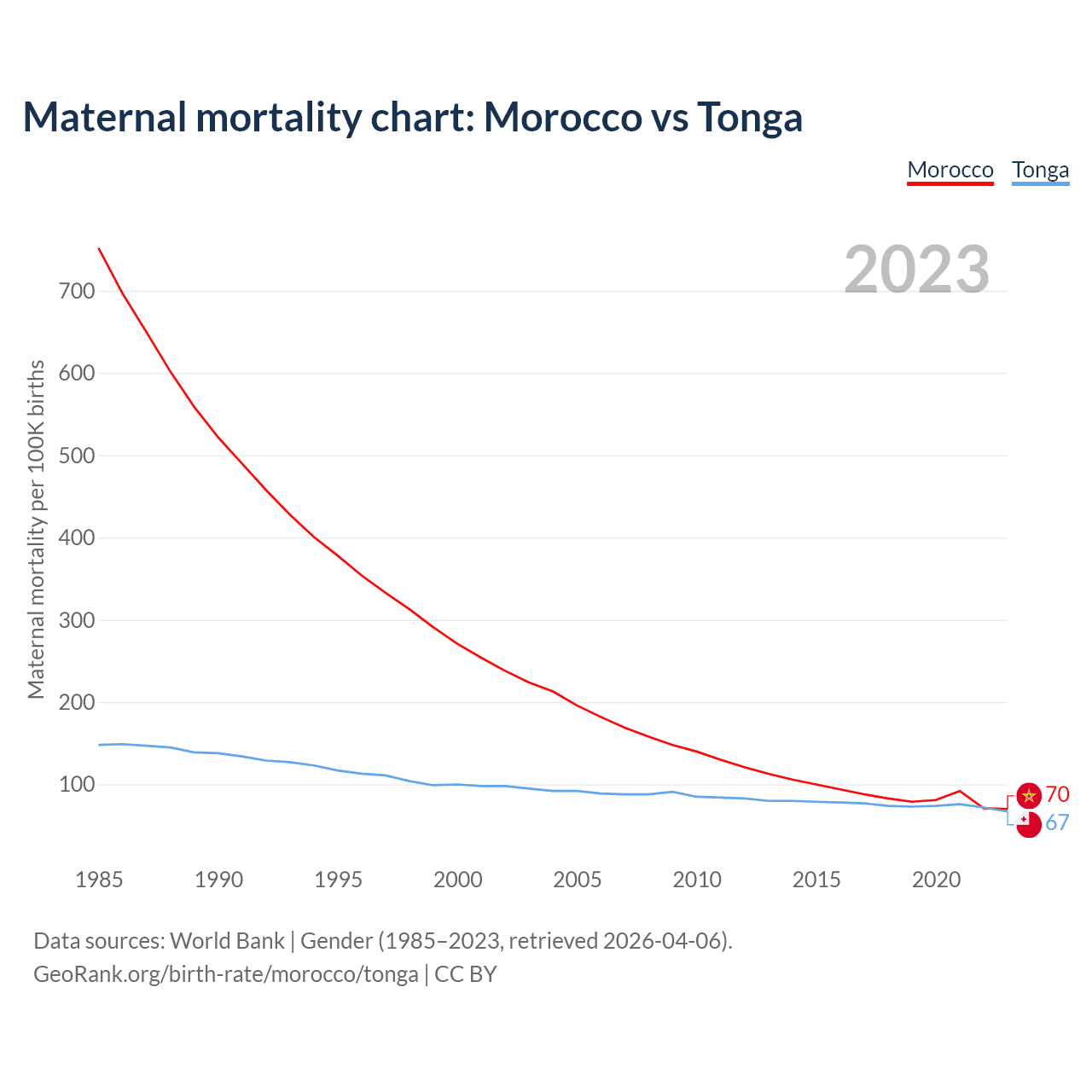 The maternal mortality rate, which is the probability of dying during childbirth or within 42 days of pregnancy termination, is 70 deaths per 100,000 live births in Morocco, compared to 67 deaths in Tonga.