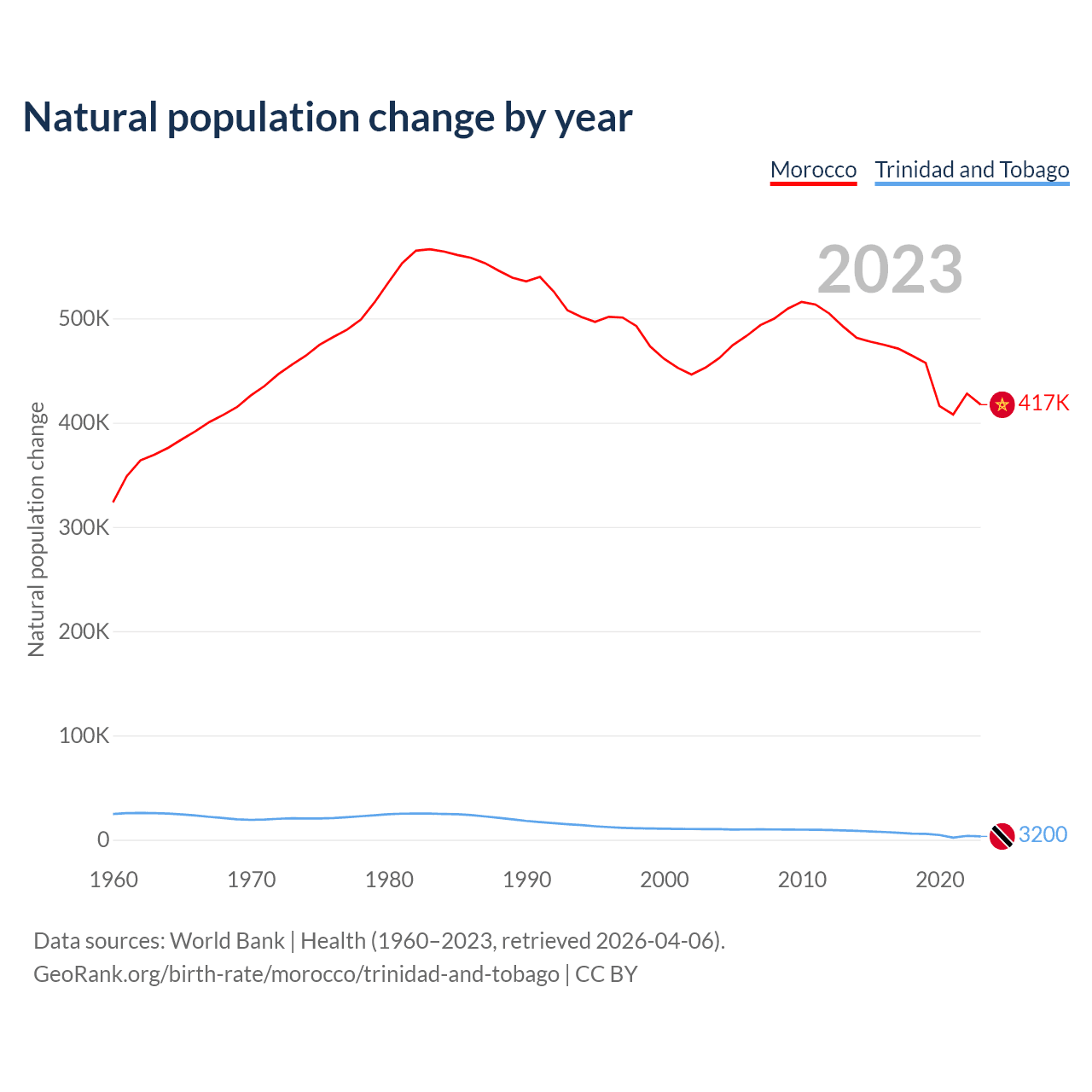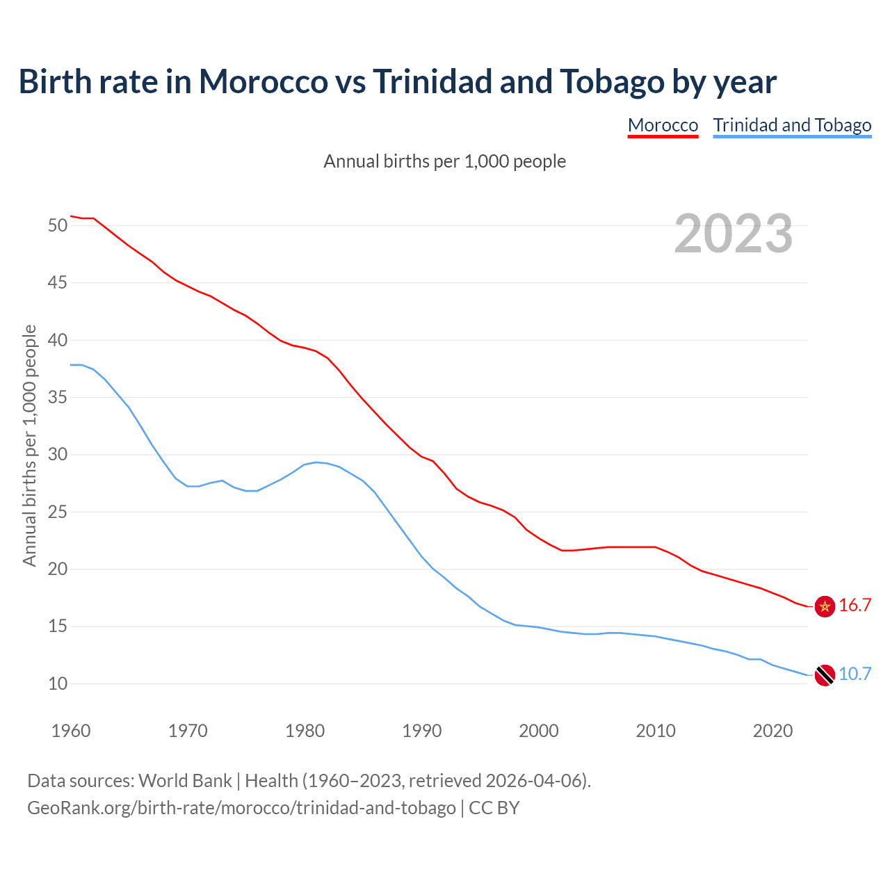 Morocco has an annual birth rate of 16.7 births per 1,000 people, compared to 10.7 for Trinidad and Tobago. The average number of children a woman is expected to have during her lifetime — the fertility rate, is 2.23 in Morocco and 1.53 in Trinidad and Tobago — 31.3% difference.