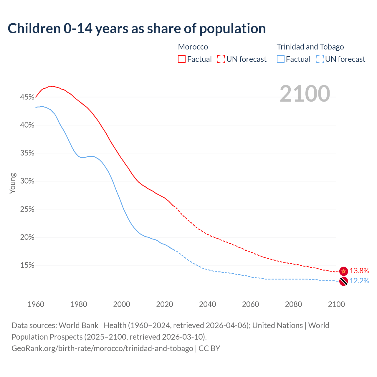 According to the latest available data on birth rates, the fertility rate in Morocco was 2.23 children per woman in 2023, compared to 1.53 in Trinidad and Tobago in 2023. The replacement level is considered to be 2.1 children per woman.
