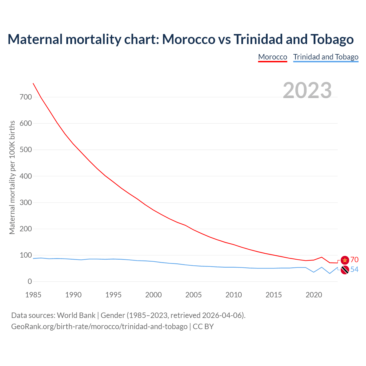 The maternal mortality rate, which is the probability of dying during childbirth or within 42 days of pregnancy termination, is 70 deaths per 100,000 live births in Morocco, compared to 54 deaths in Trinidad and Tobago.