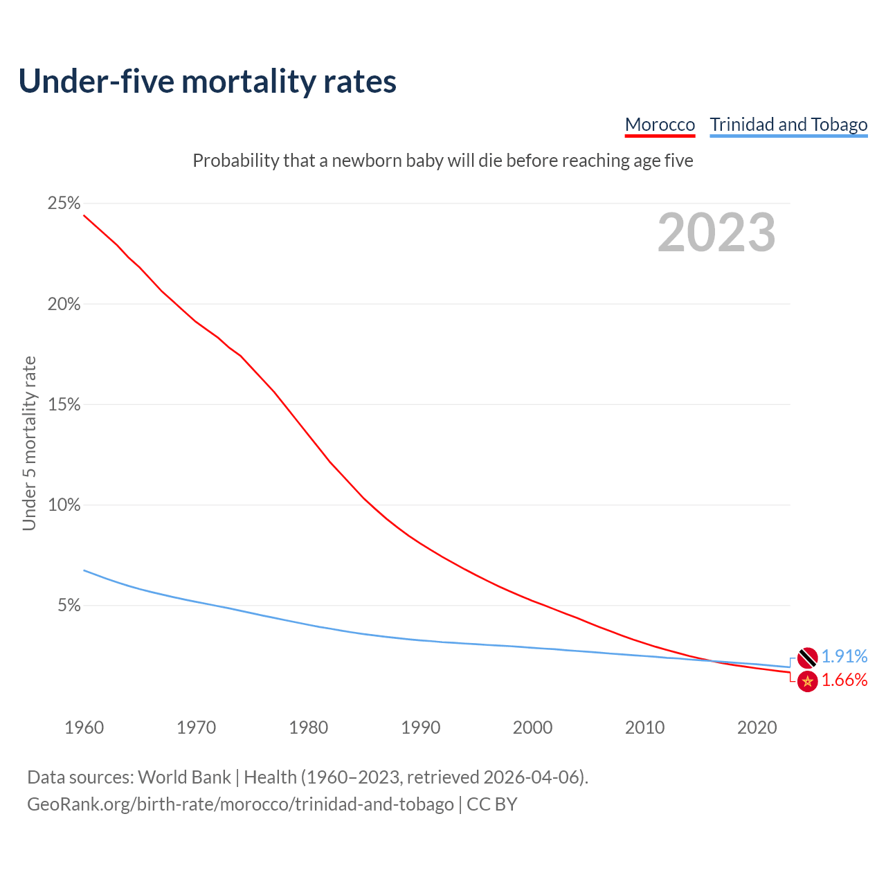 The chance that a newborn baby will die before reaching age five is 1.66% in Morocco and 1.91% in Trinidad and Tobago. Above is a chart with historical data on under-five mortality rates.