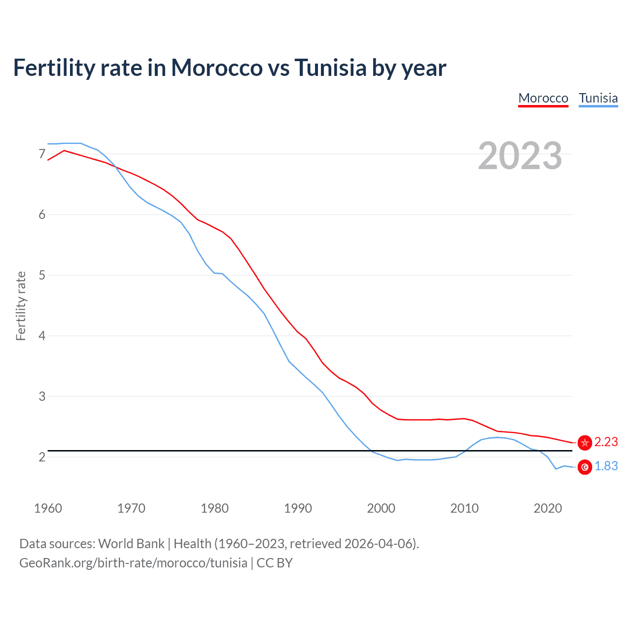 1960 vs 2023, the fertility rate has decreased by 67.6% in Morocco and by 74.4% in Tunisia — in 1960, it was 6.89 and 7.16, respectively.